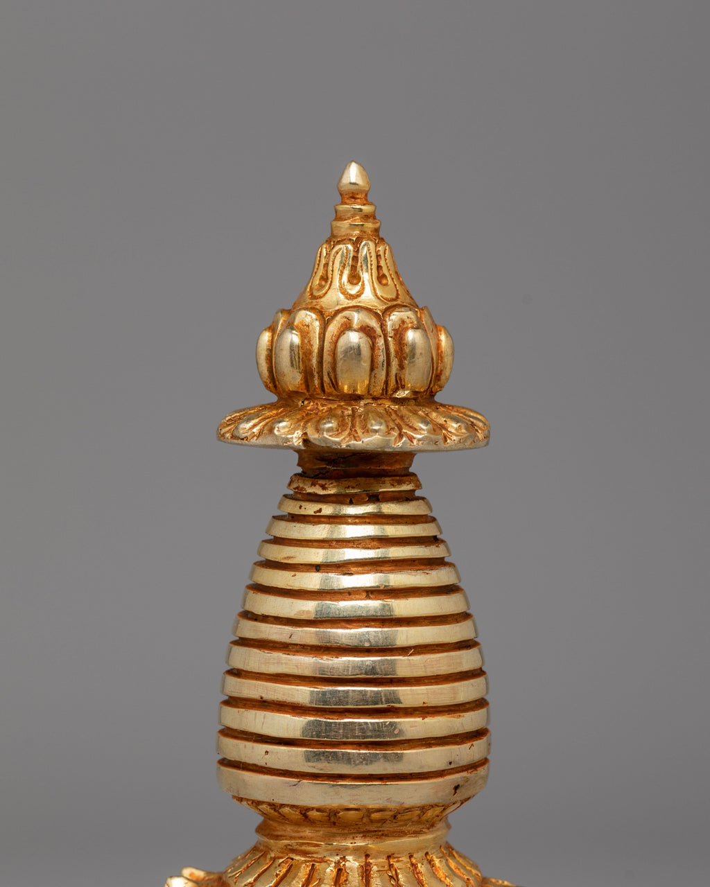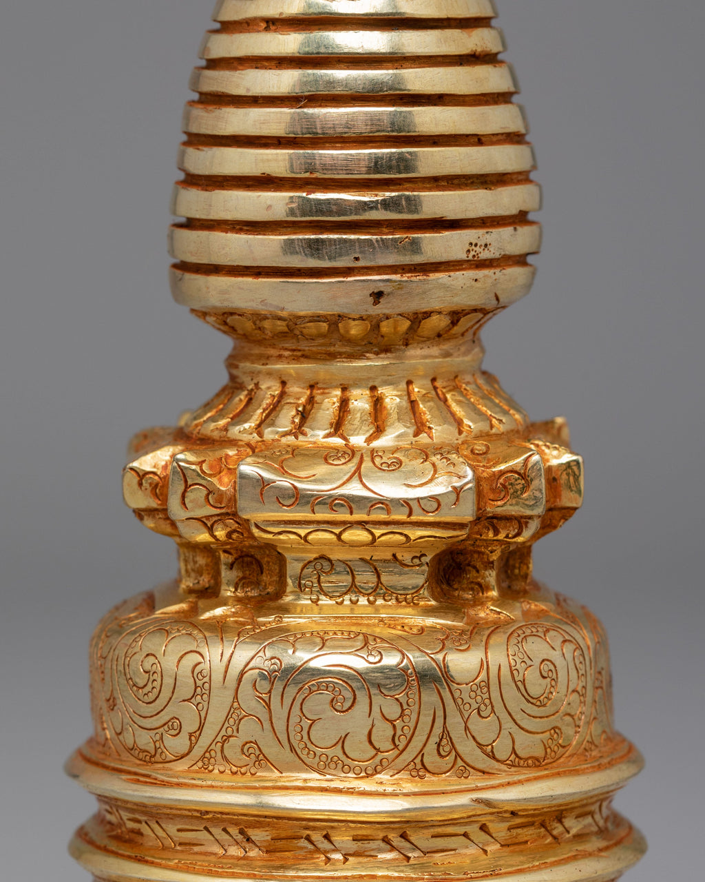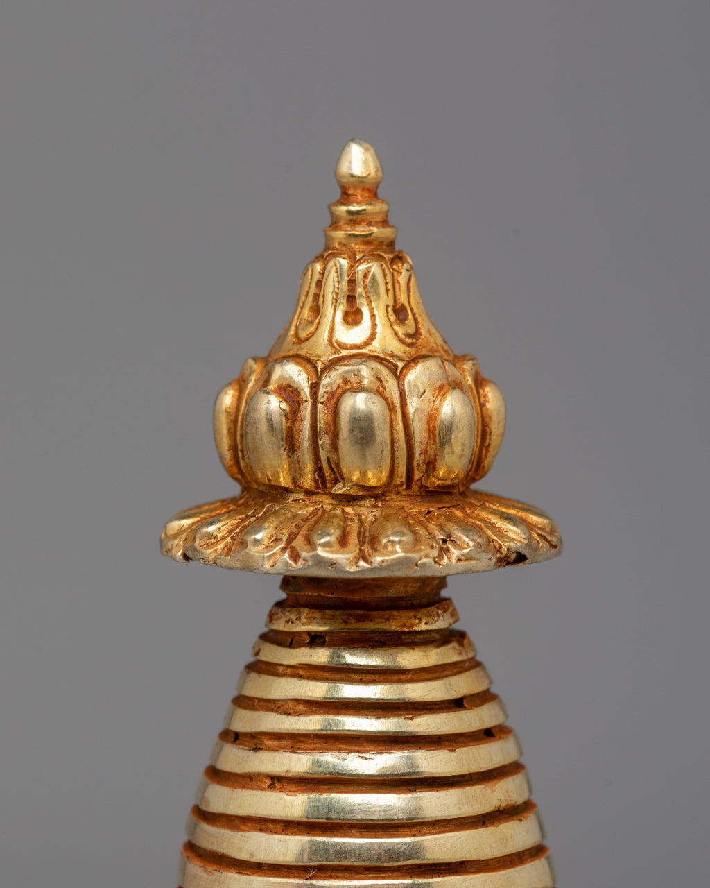 The Spiritual Protection Stupa is a sacred representation of peace, purity, and divine energy. Expertly handcrafted from copper with a radiant gold-plated finish, this elegant piece stands 7.5 inches high and 3.75 inches wide, weighing 0.65kg. The stupa’s golden hue reflects light beautifully, symbolizing enlightenment and the awakened mind. Traditionally used in Buddhist practice, it is believed to bring protection, harmony, and spiritual strength to any space, making it an ideal addition to meditation rooms or sacred home altars.