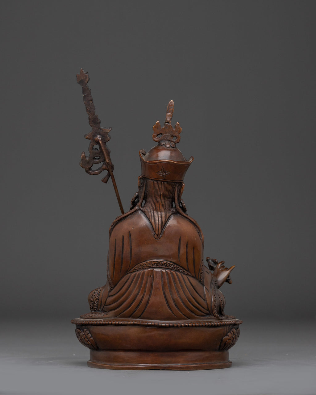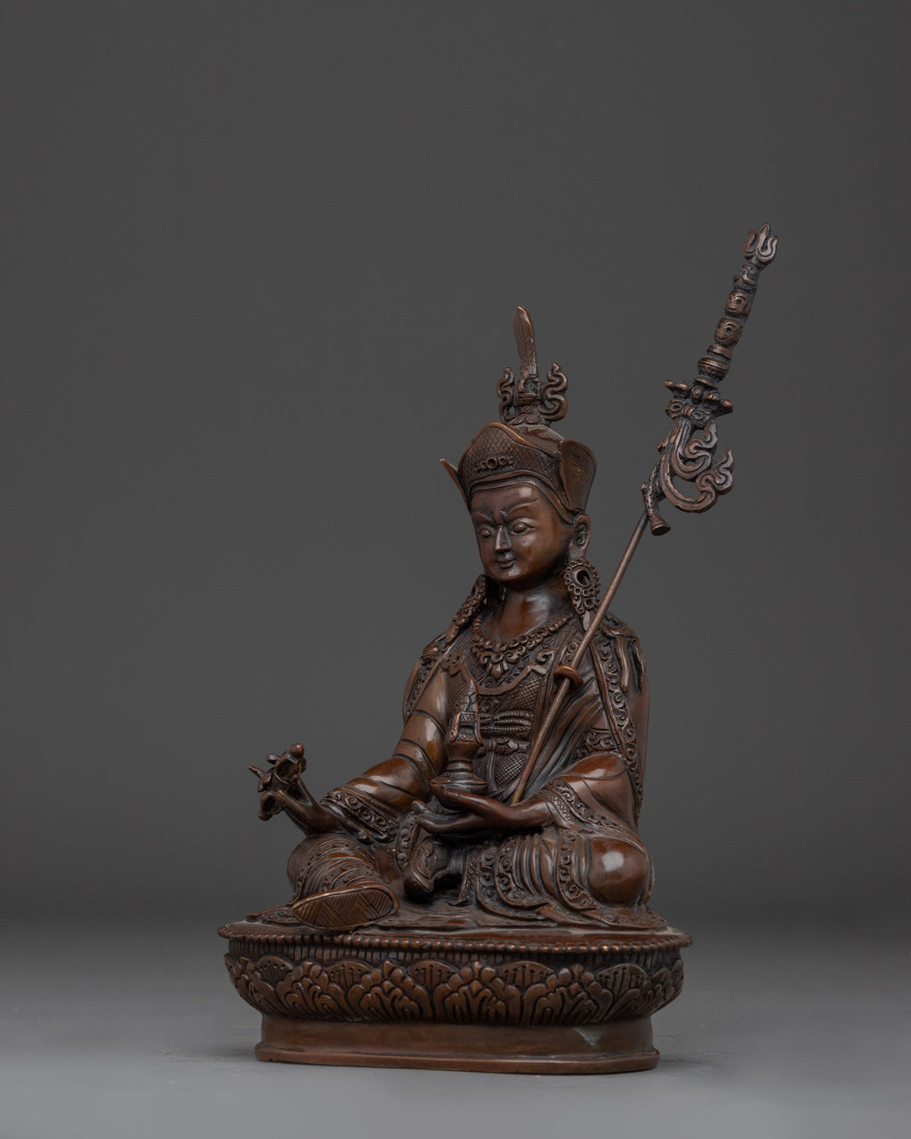 Guru Rinpoche is represented sitting in a royal posture, presenting confidence and spiritual mastery. His right hand holds a vajra, which represents indestructible power, while his left hand holds a skull cup (kapala) filled with the nectar of wisdom. The khatvanga, a trident ornamented with symbolic components reflecting his tantric attainment and the union of wisdom and compassion, rests on his left shoulder.