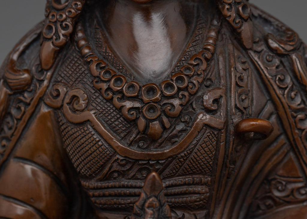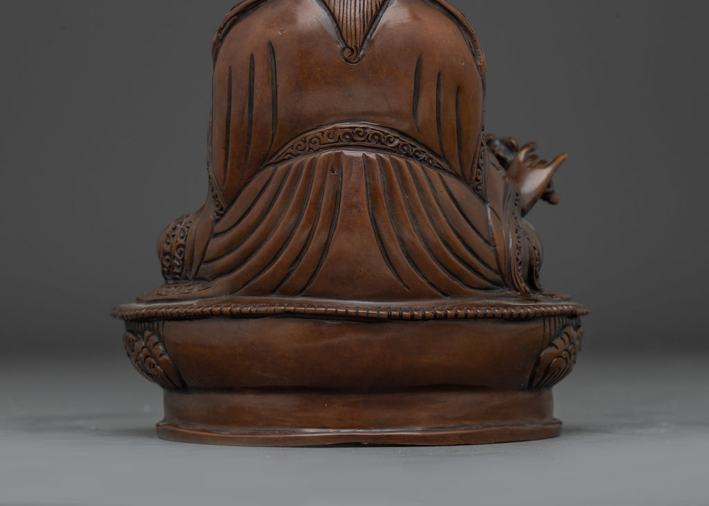 The Spiritual Protector Guru Rinpoche Artwork, also known as Padmasambhava, the founder of Tibetan Buddhism, represents enlightenment, compassion, and spiritual mastery. This handcrafted statue is 9.6" (Height) x 5.9" (Base) and weighs 1.23 kg. It is made of solid oxidized copper. Created by expert Nepalese artisans, it represents Himalayan Buddhism's holy traditions, making it an appealing addition to altars, meditation places, or sacred collections.