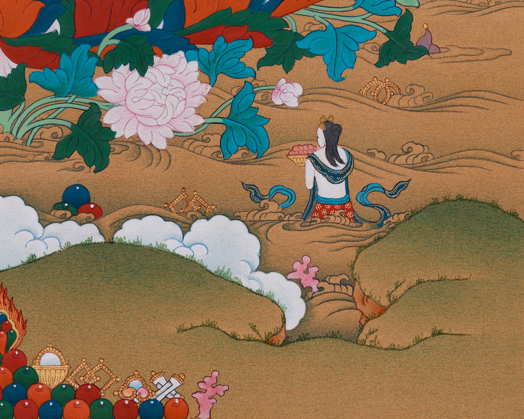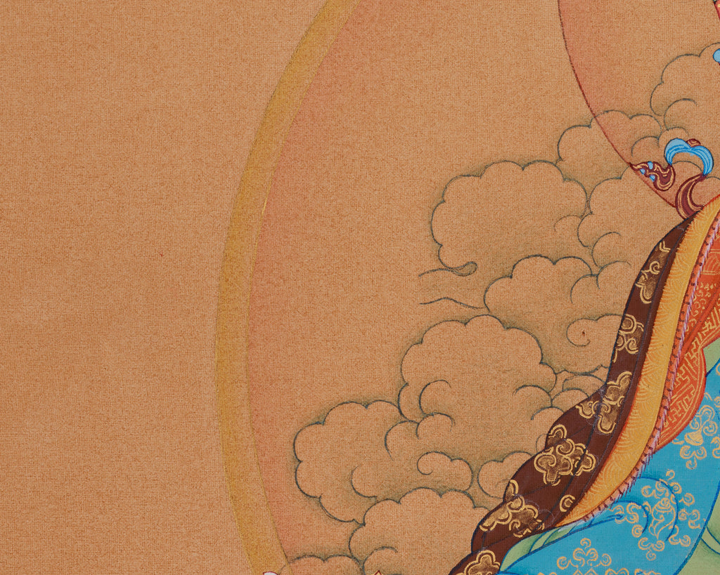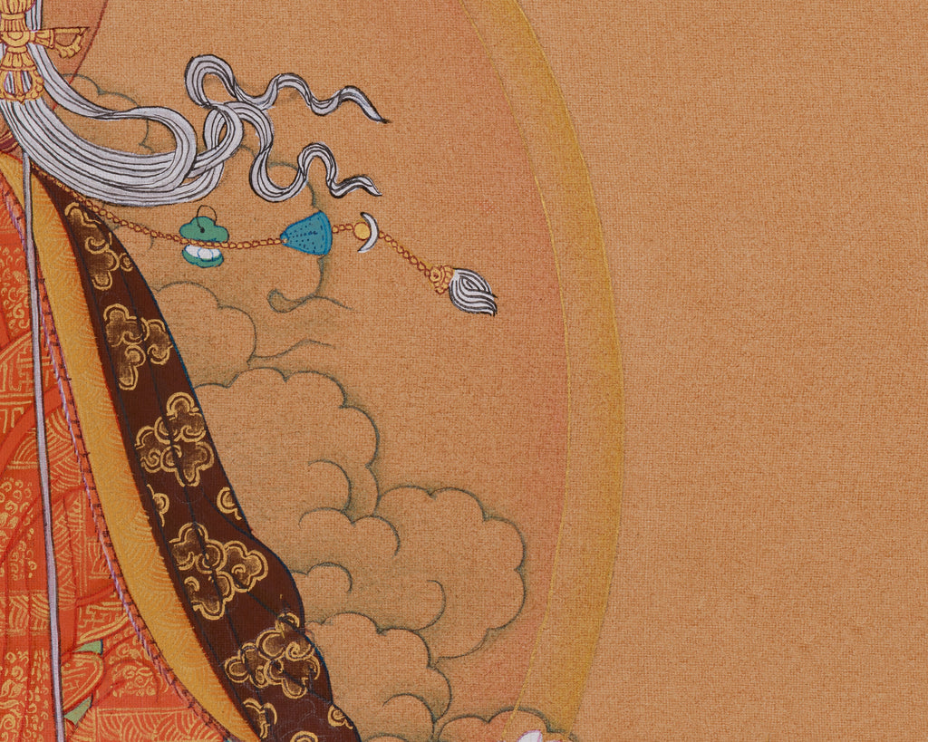 In the traditional Karma Gadri technique, the spiritual teacher Guru Rinpoche Thangka is hand-painted on fine cotton canvas using brilliant acrylic colors and 24K gold. Gold is meticulously applied to ornaments, tools, and the halo to enhance depth and spiritual meaning, with the mineral hues emitting a gentle glow that matures over time. These traditional materials are selected to honor Guru Rinpoche's role as the supreme spiritual teacher who illuminates the path from ignorance to enlightenment, and to recognize their strength and aesthetic value.