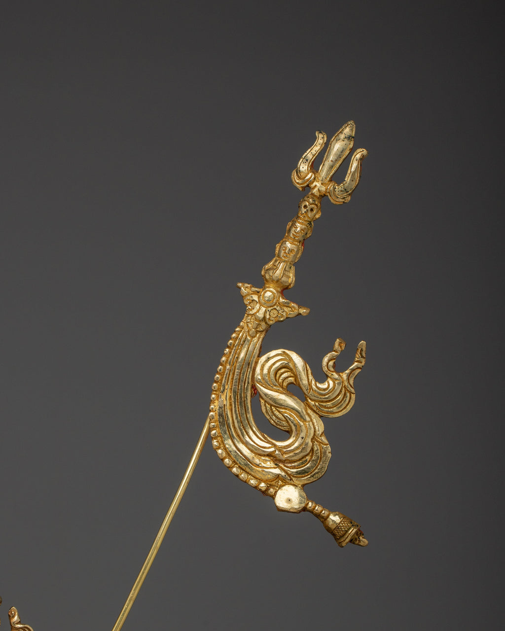 Guru Rinpoche is represented sitting in a royal posture, presenting confidence and spiritual mastery. His right hand holds a vajra, which represents indestructible power, while his left hand holds a skull cup (kapala) filled with the nectar of wisdom. The khatvanga, a trident ornamented with symbolic components reflecting his tantric attainment and the union of wisdom and compassion, rests on his left shoulder.