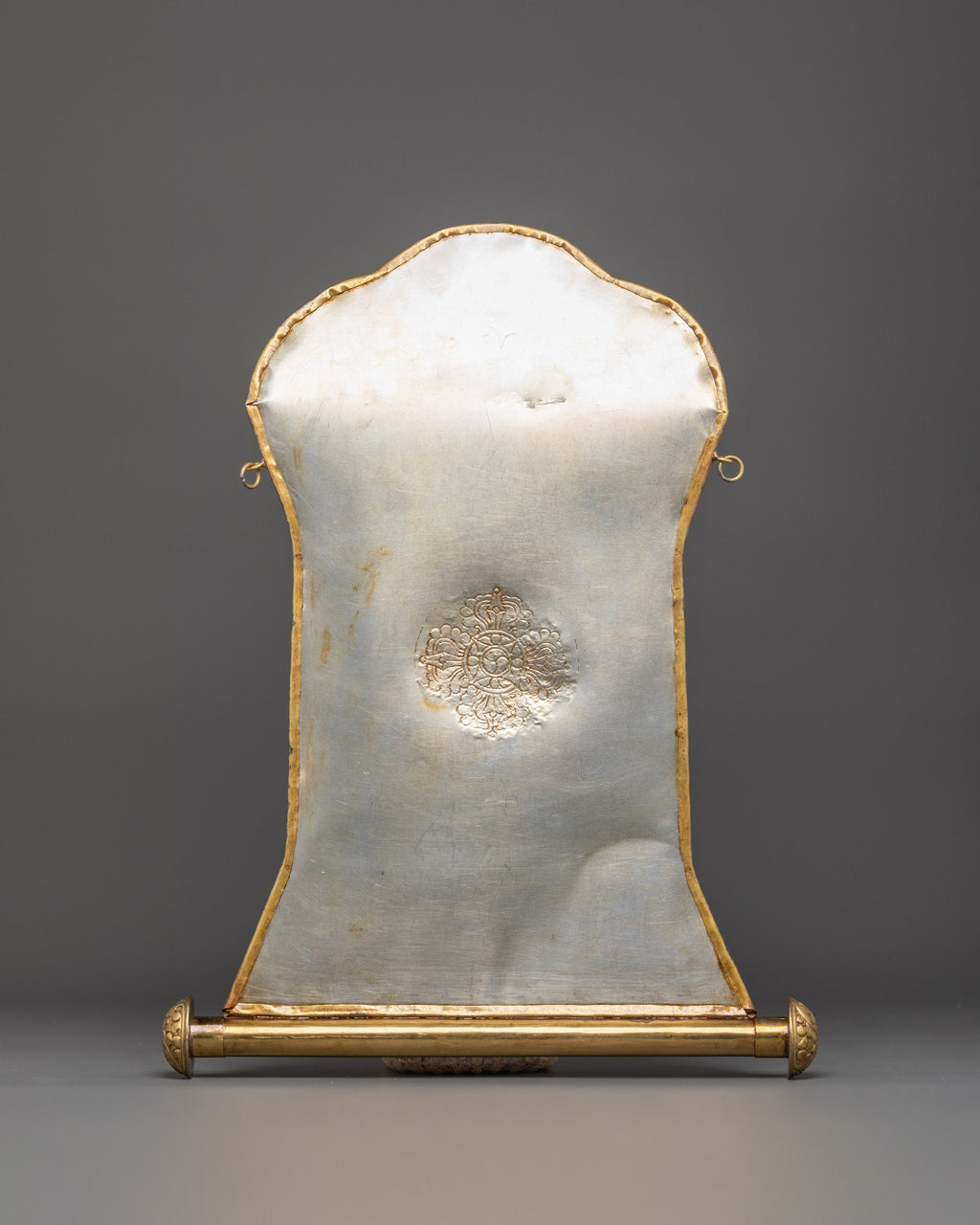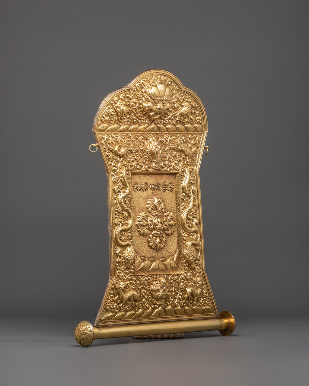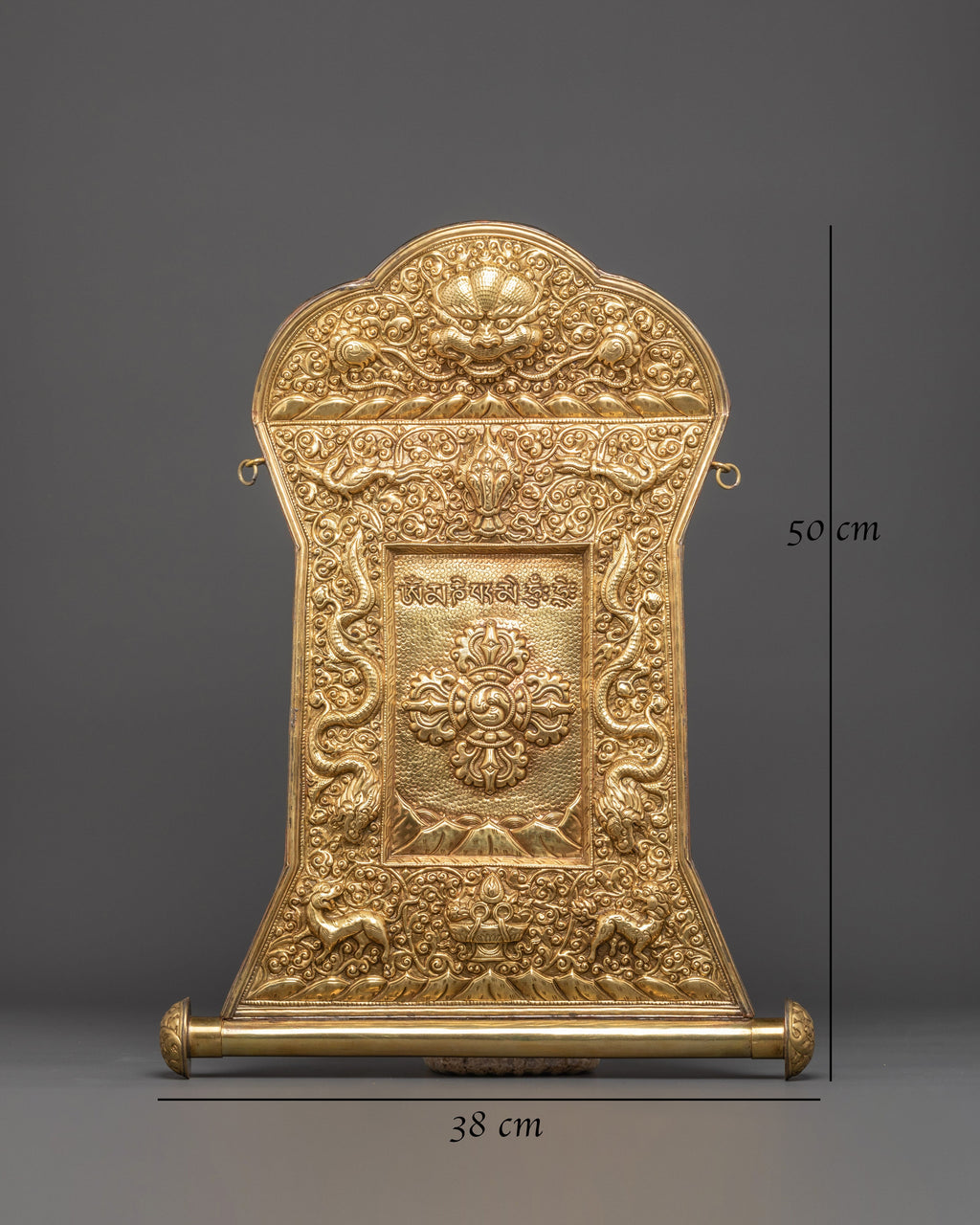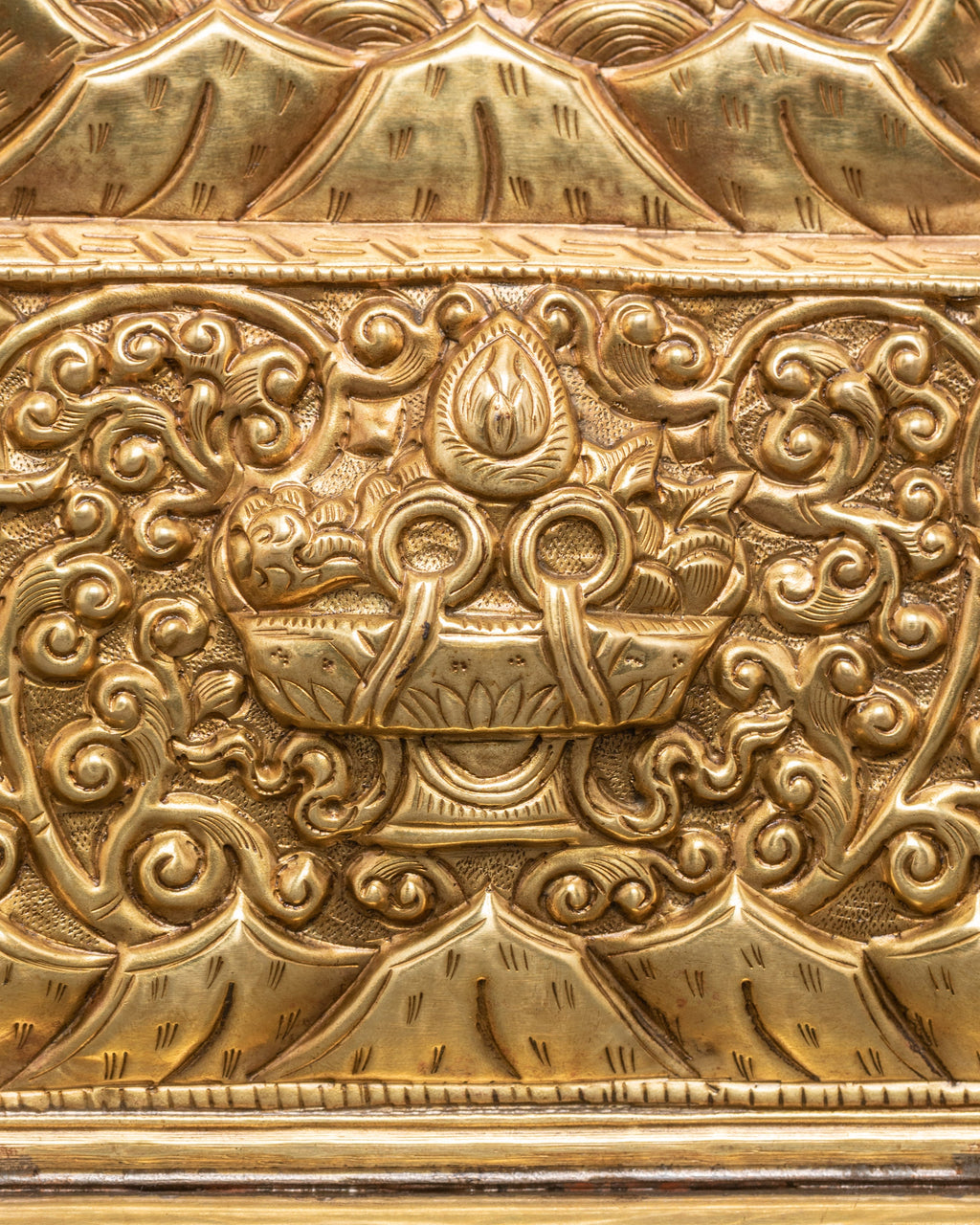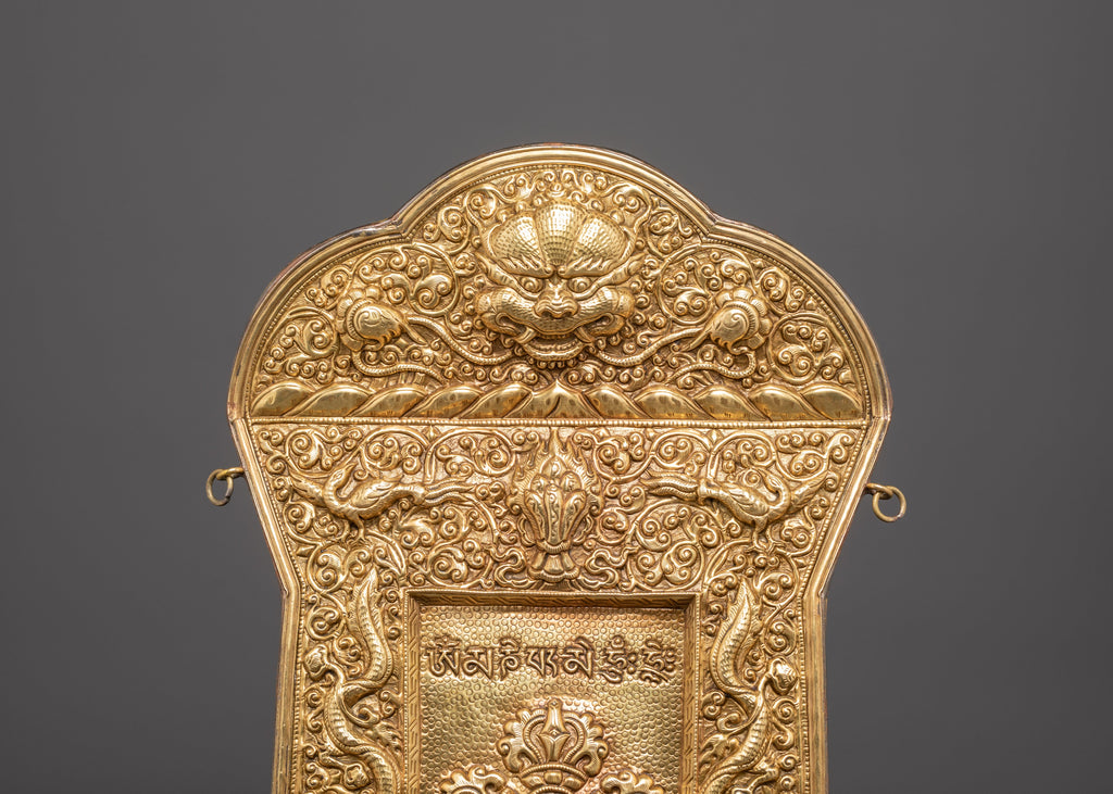 The design is further adorned with detailed motifs, including Chepu (Makara heads) and auspicious patterns that embody divine guardianship. These protective symbols are believed to dispel negative energies while inviting peace, prosperity, and spiritual growth. The rich golden hue of the brass enhances its sacred presence, making it an inspiring wall piece for meditation spaces, home altars, or cultural collections.