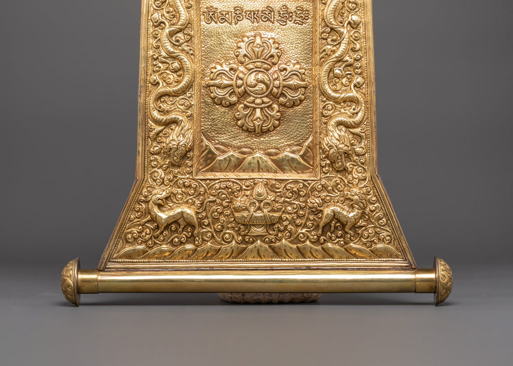 This Spiritual Tibetan Buddhist Wall Hanging is a remarkable piece of sacred Himalayan art, meticulously handcrafted from brass. Measuring 50cm in height and 38cm in width, and weighing 1.07kg, it features the revered Double Vajra (Vishvavajra) at its center, radiating powerful spiritual energy. The Vishvavajra represents stability, enlightenment, and protection, with its four prongs extending in all directions as a symbol of the unshakable foundation of the Dharma.