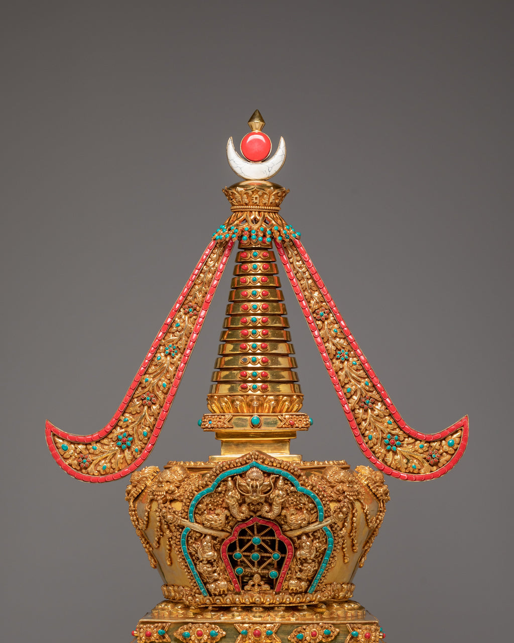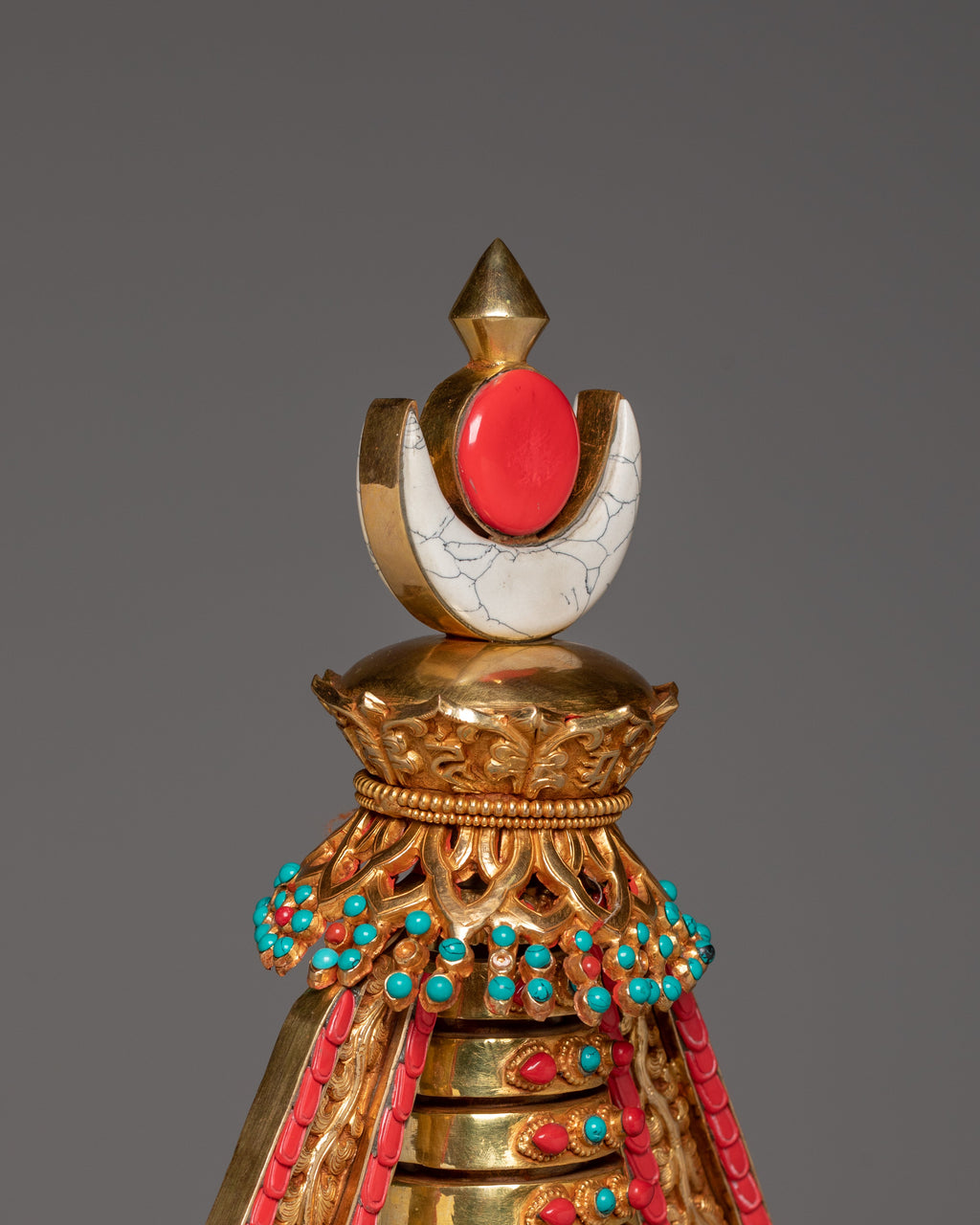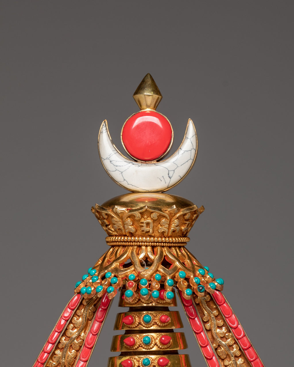 Each detail of this gold-plated Tibetan stupa is meticulously crafted to honor the traditional artistry of the Himalayas. The base features engraved floral motifs and sacred carvings, while the ascending tiers are embellished with intricate stonework. The crescent moon and sun atop the stupa signify enlightenment and the unity of wisdom and compassion. The vibrant red coral and blue turquoise inlays contrast beautifully with the gold surface, embodying balance between strength and serenity. This stupa is not only a devotional art form but also a vessel of blessings, inviting positive vibrations and spiritual protection.