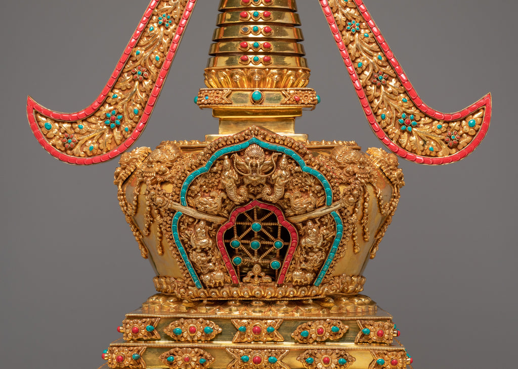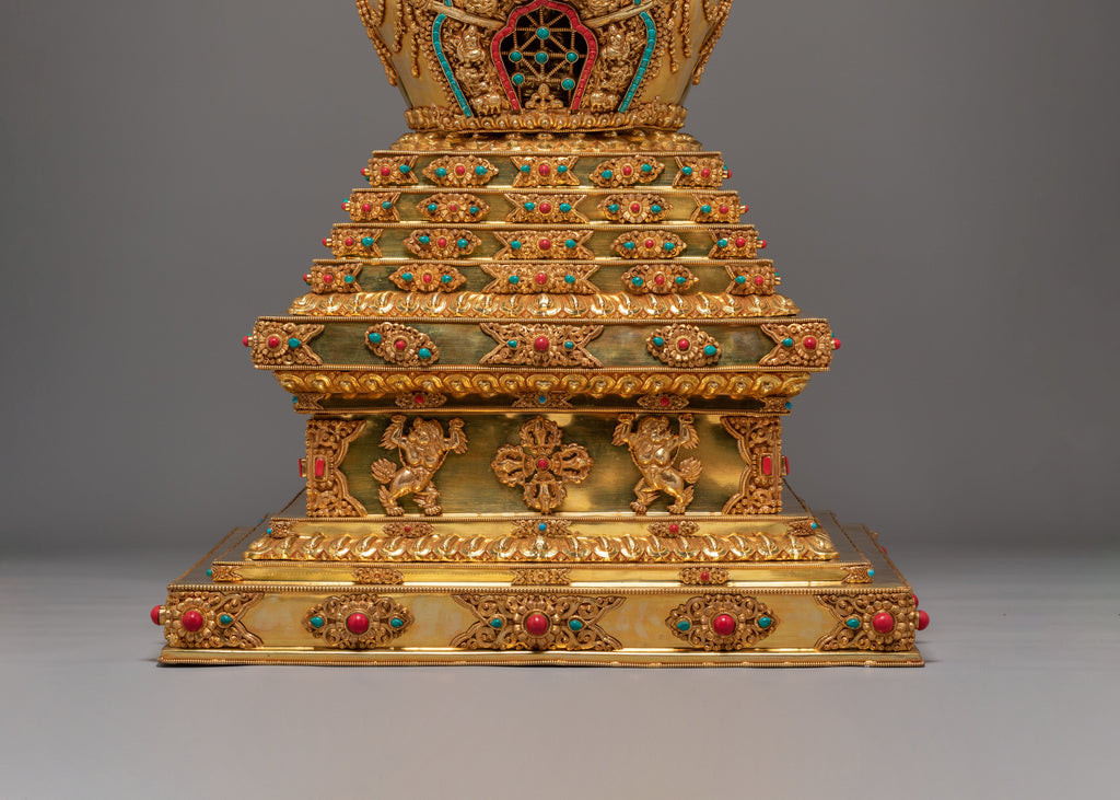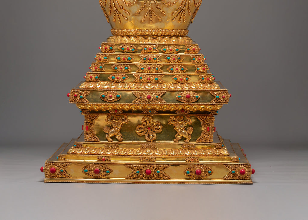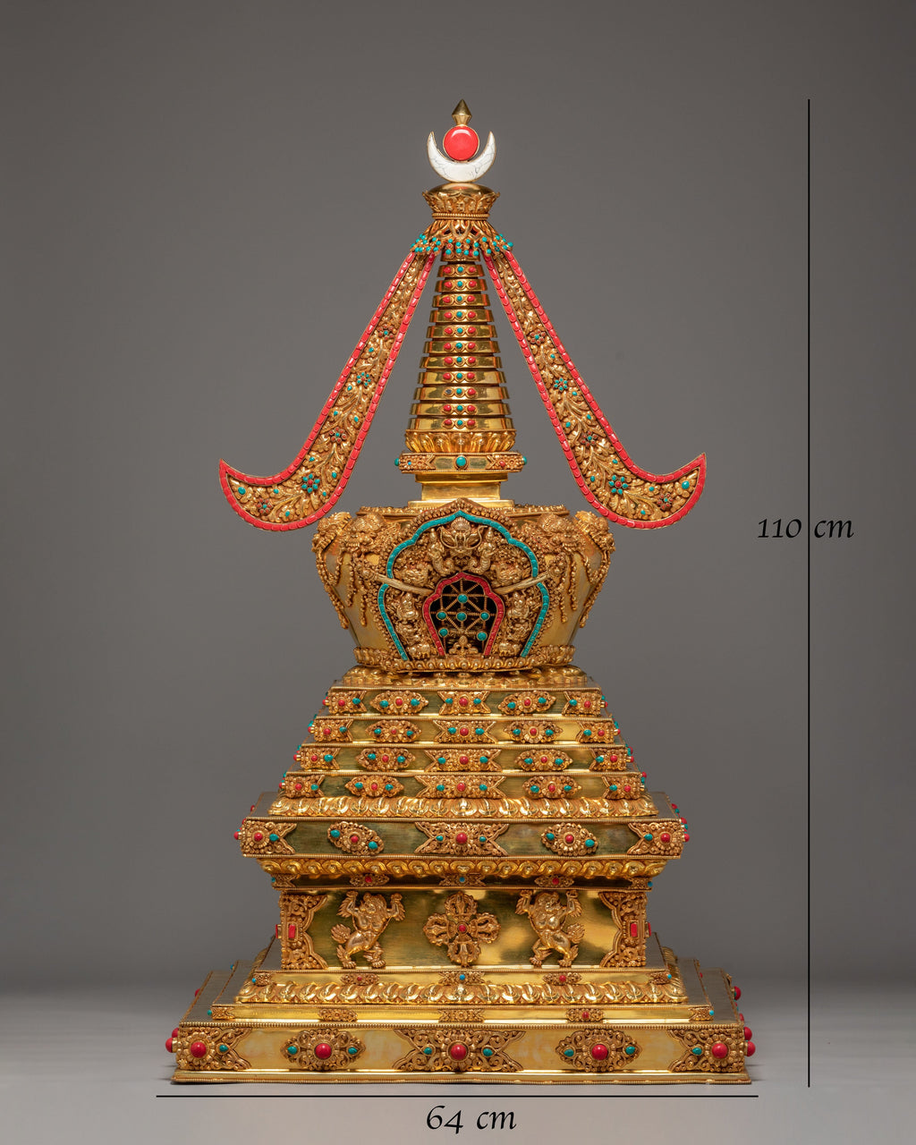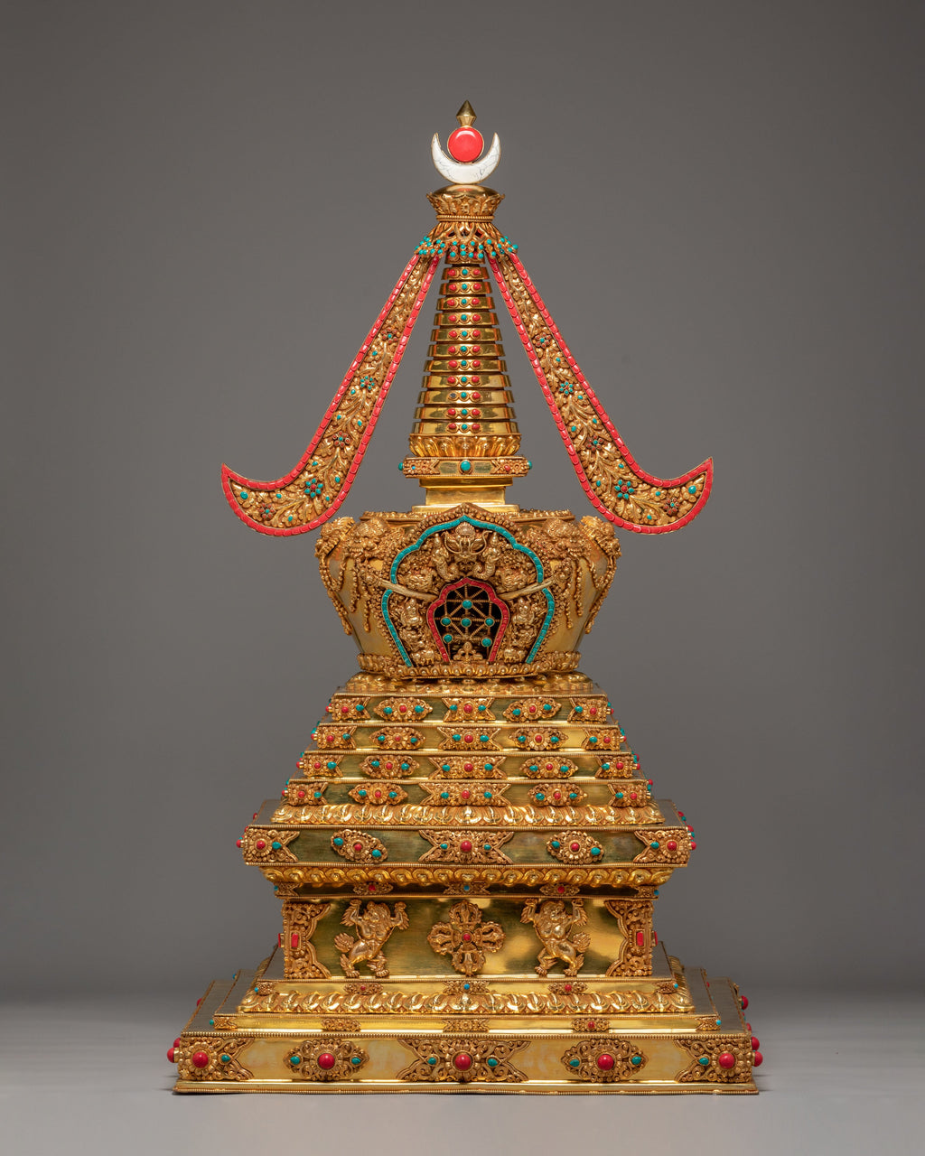 Each detail of this gold-plated Tibetan stupa is meticulously crafted to honor the traditional artistry of the Himalayas. The base features engraved floral motifs and sacred carvings, while the ascending tiers are embellished with intricate stonework. The crescent moon and sun atop the stupa signify enlightenment and the unity of wisdom and compassion. The vibrant red coral and blue turquoise inlays contrast beautifully with the gold surface, embodying balance between strength and serenity. This stupa is not only a devotional art form but also a vessel of blessings, inviting positive vibrations and spiritual protection.