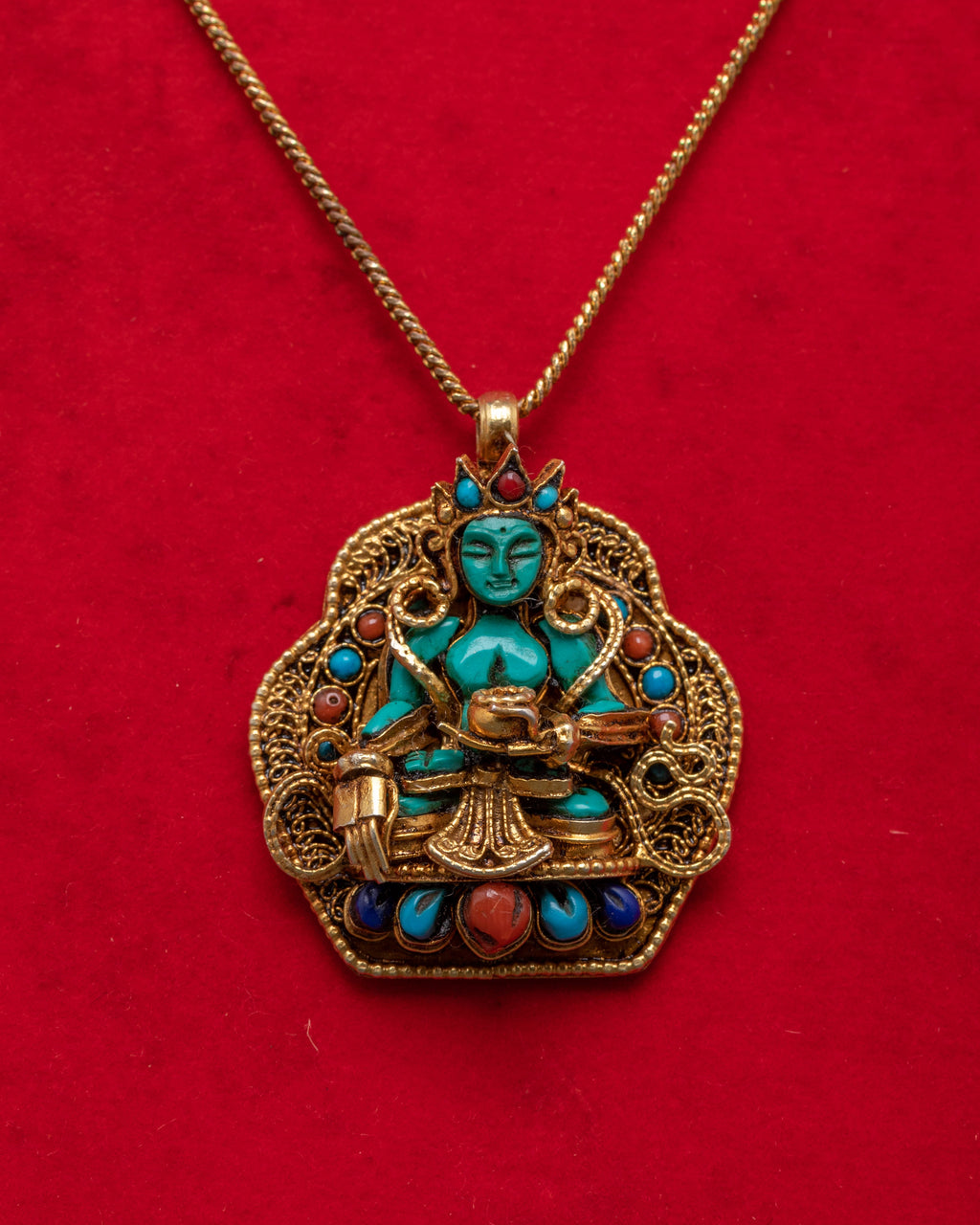 The Tibetan Turquoise Buddha Locket is a sacred piece of Buddhist jewelry, crafted with silver and plated in gold, set with turquoise, lapis lazuli, and coral stones. At the center is Shakyamuni Buddha, depicted in calm meditation holding an alms bowl, symbolizing his wisdom, compassion, and the path to liberation. The turquoise radiates harmony and healing, coral brings vitality, and lapis represents clarity, making this locket a meaningful union of artistry and spiritual depth.