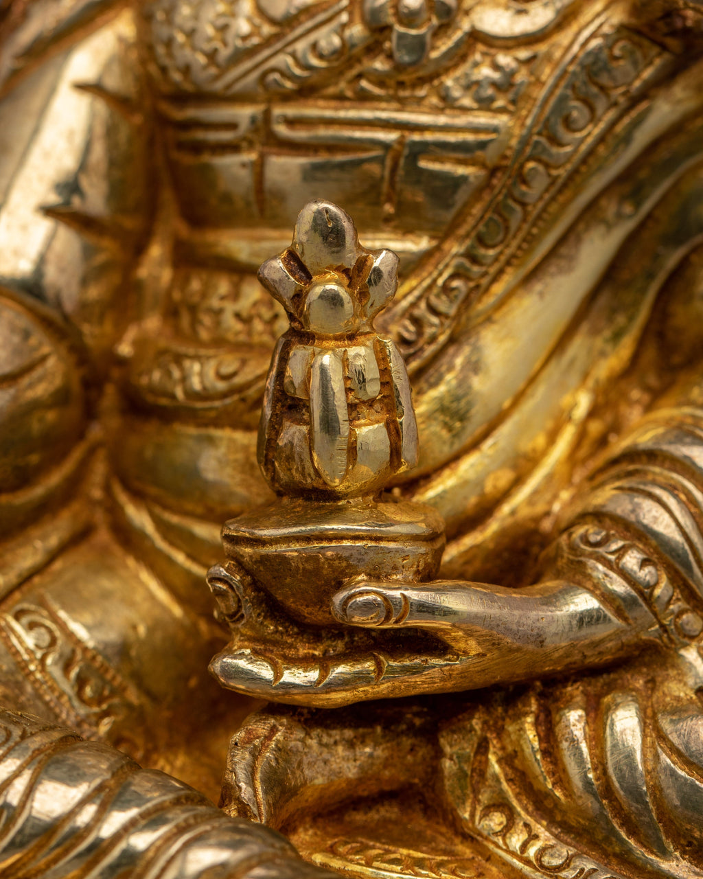 The Spiritual Transformation Deity Guru Rinpoche Art, also known as Padmasambhava, the founder of Tibetan Buddhism, represents enlightenment, compassion, and spiritual mastery. This handcrafted statue is 6.5" (Height) x 4.3" (Base) and weighs 0.57 kg. It is made of solid copper, adorned with 24K gold gilding, and enhanced with detailed gold and acrylic paints. Created by expert Nepalese artisans, it represents the holy traditions of Himalayan Buddhism, making it an appealing addition to altars, meditation spaces, or sacred collections.