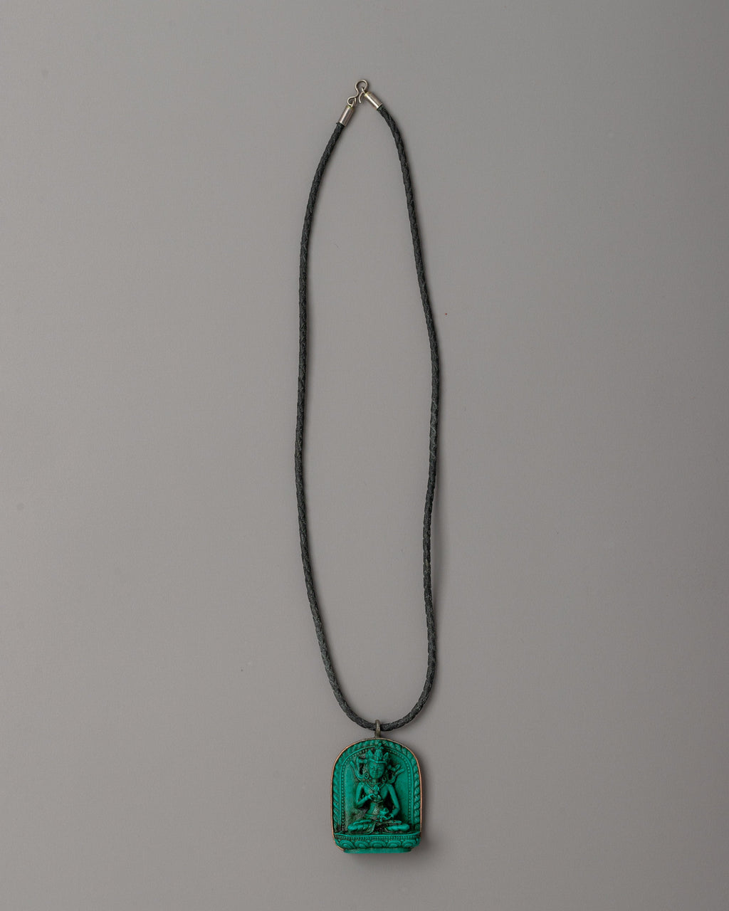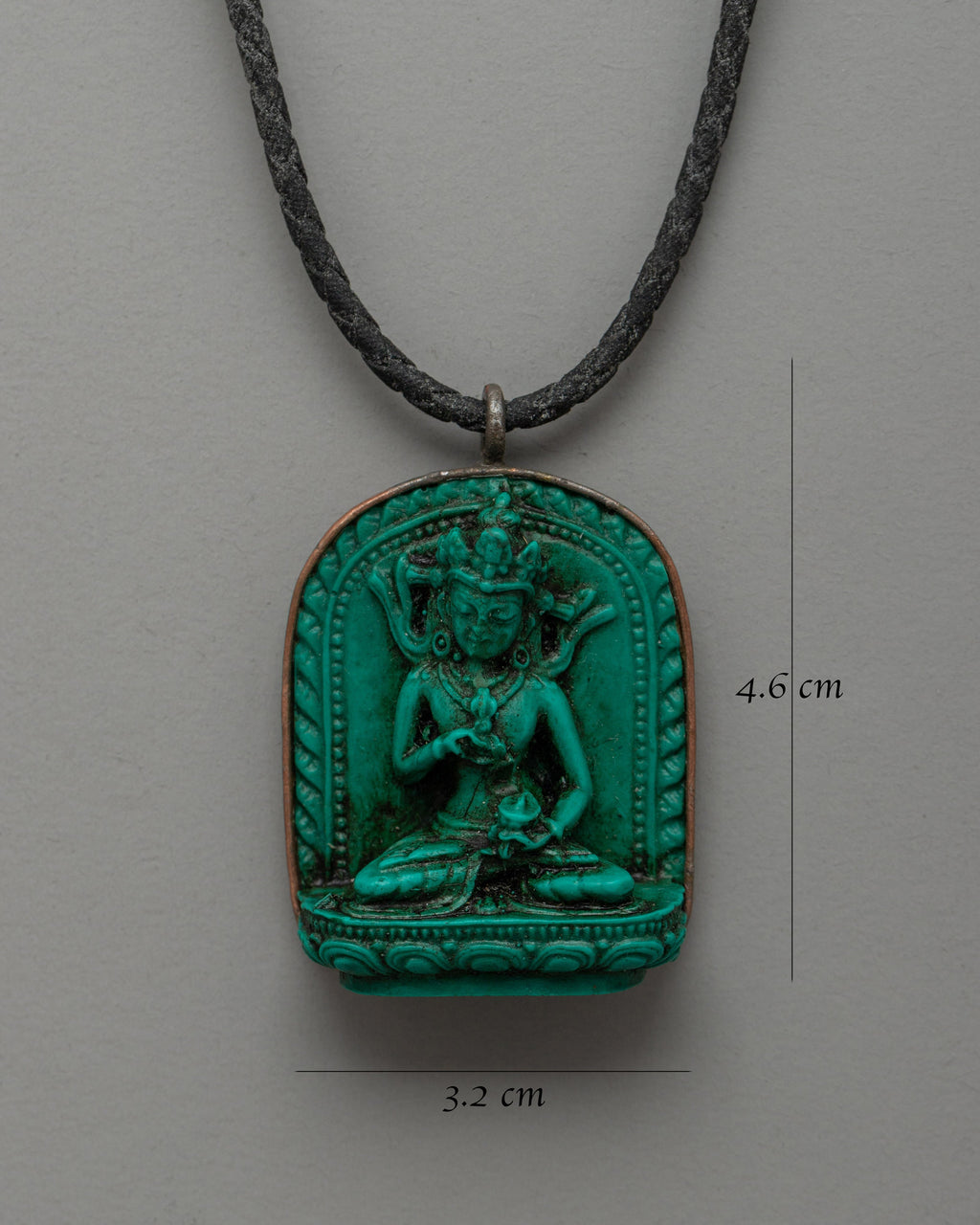 The green resin carving is expertly crafted and protected in a copper frame, making this locket a profound spiritual charm. It weighs only 0.010kg but has incredible spiritual significance. Whether worn as a symbol of regeneration, a meditation tool, or a protection charm, this Vajrasattva necklace promotes inner peace and spiritual advancement. This artwork is an excellent present for Buddhist practitioners, meditation admirers, and seekers of enlightenment as a reminder of divine wisdom and the power of purification.