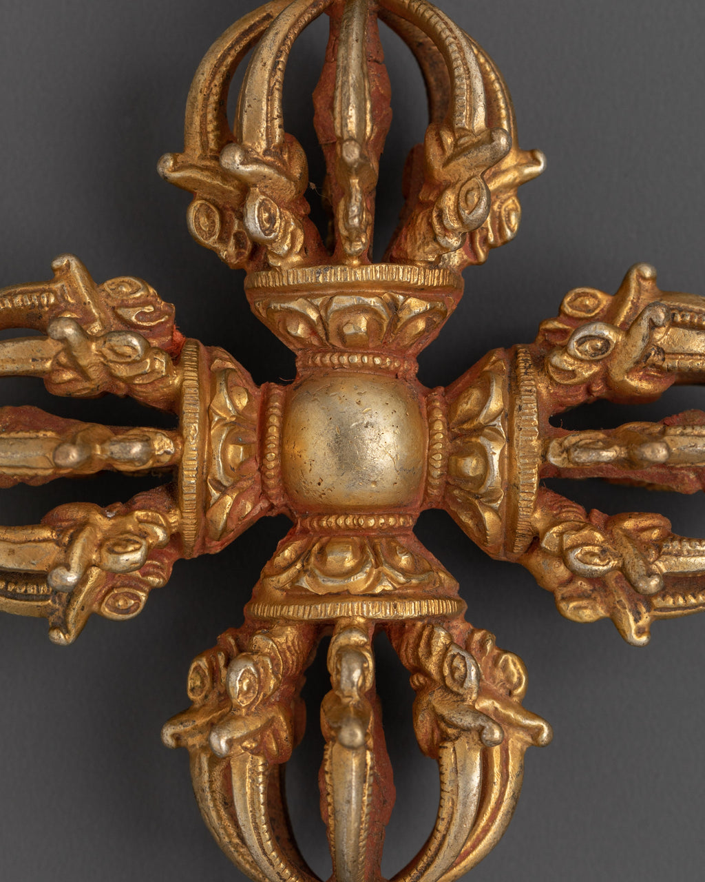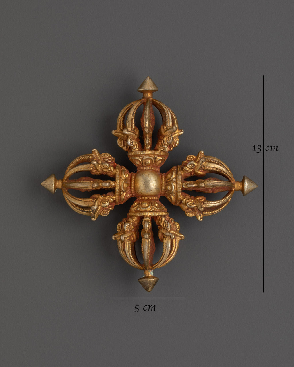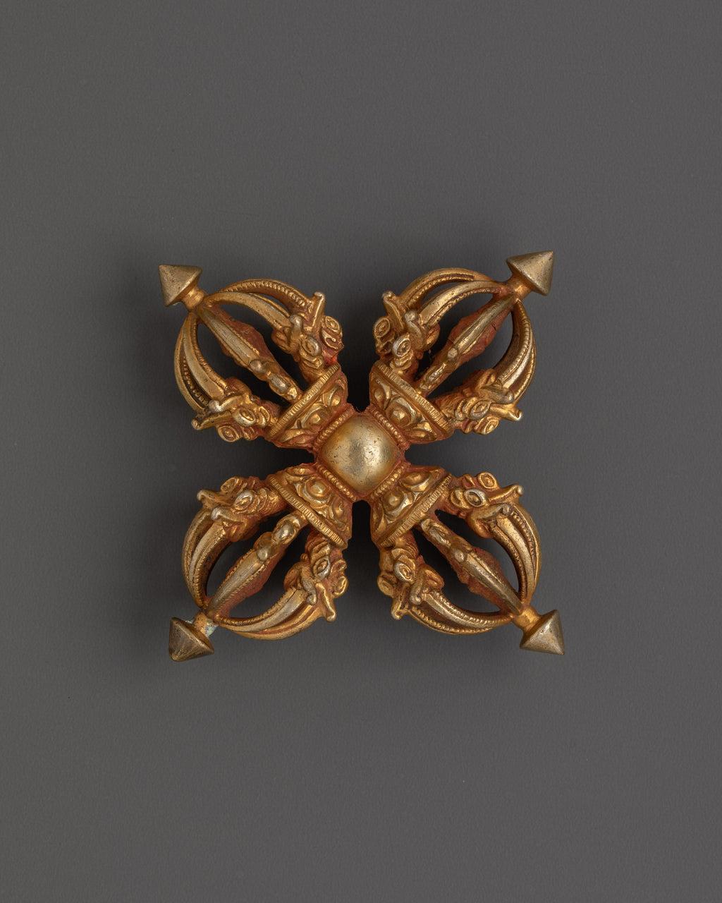 This Spiritual Vishwo Vajra is exquisitely crafted to reflect the profound wisdom and protective energy of the Tibetan Vajra. Its four-pointed design represents the four directions as well as the five elements, which reflect spiritual strength and unity. The gold-plated finish gives it a bright and sacred aspect, while the copper heightens its spiritual vibration, creating an environment favorable to reflection and healing. Whether employed for meditation, prayer, or as a decorative piece in your house, this Vishwo Vajra is an effective tool for spiritual practice, energy healing, and protection.