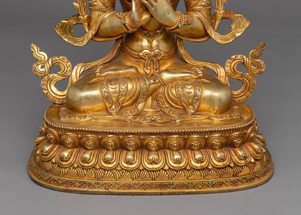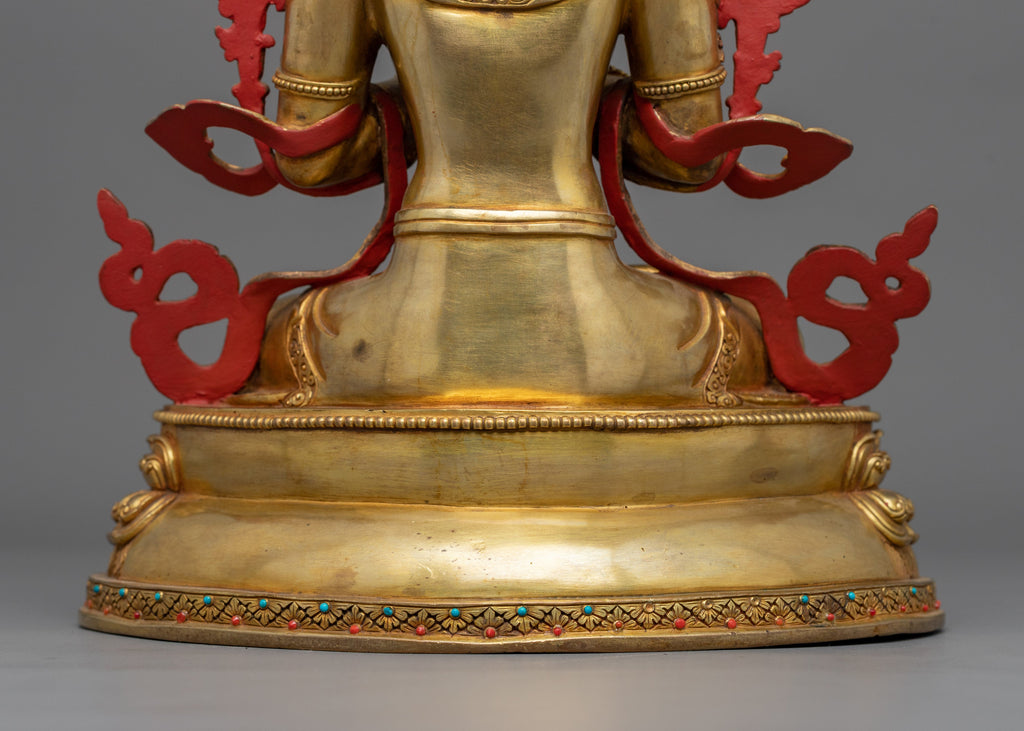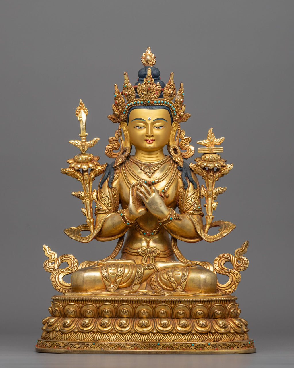 Manjushri is depicted holding his flaming sword in his right hand, representing the cutting of ignorance and the illumination of truth. His left hand gently holds a lotus bloom, symbolizing the blossoming of wisdom and purity. His tranquil look shows both knowledge and compassion, embodying the balance between intellectual clarity and sympathetic understanding. This Manjushri Figurine is ideal for altars, meditation places, or as a gift for individuals looking for spiritual guidance.