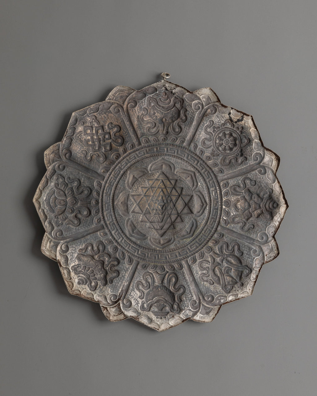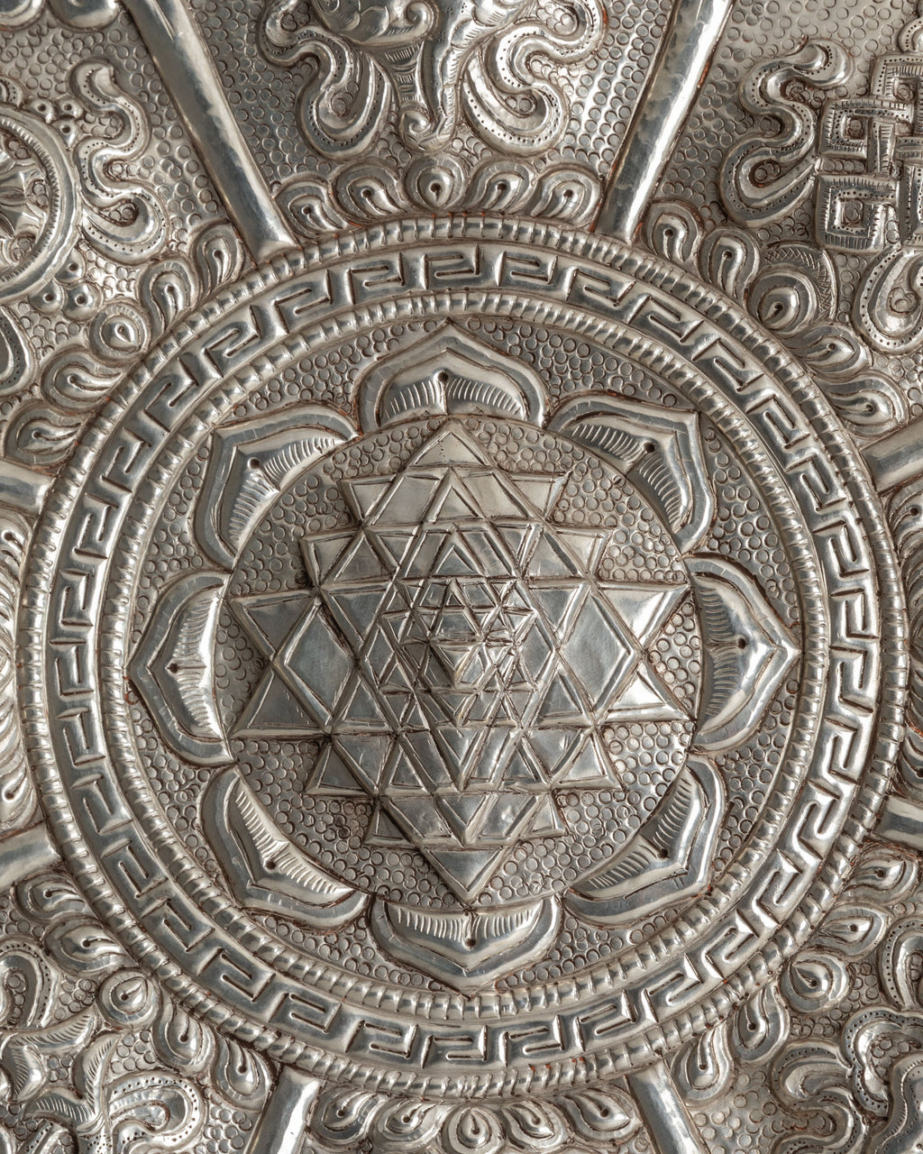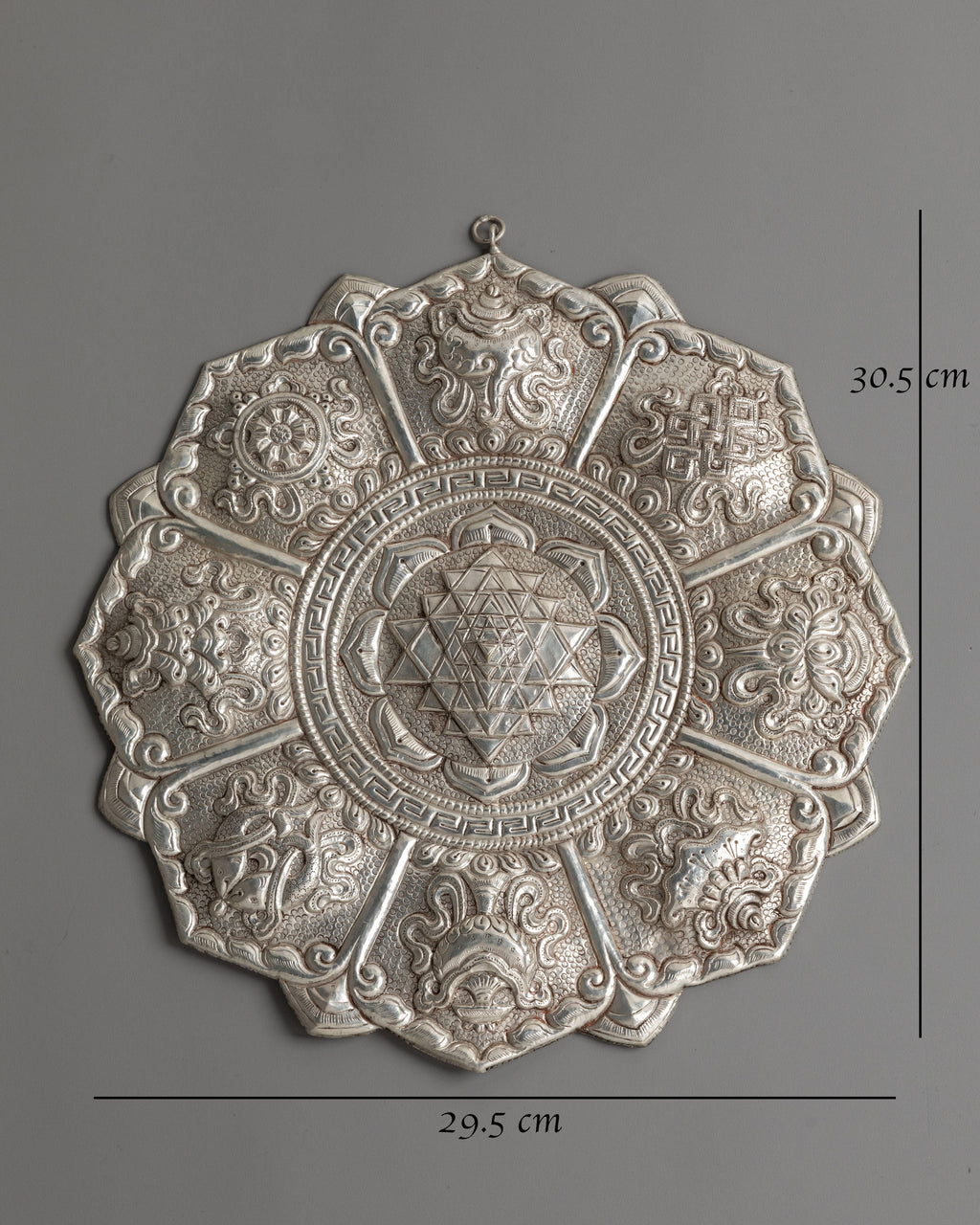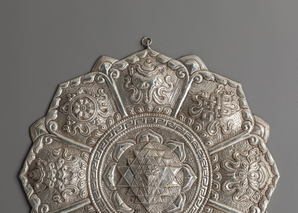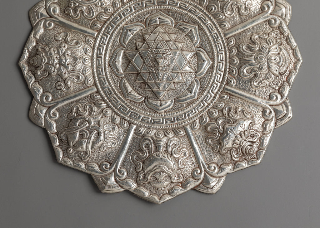 The intricate design features the central Sri Yantra, composed of interlocking triangles that represent universal creation and inner balance. Surrounding the core geometry are detailed lotus petals and traditional motifs symbolizing purity, expansion, and higher consciousness. Each petal section includes ornate carvings of floral elements and sacred symbols, all meticulously crafted to reflect the spiritual significance and artistic heritage of Himalayan metalwork. The silver-plated surface enhances every detail, giving the piece a striking, refined look.
