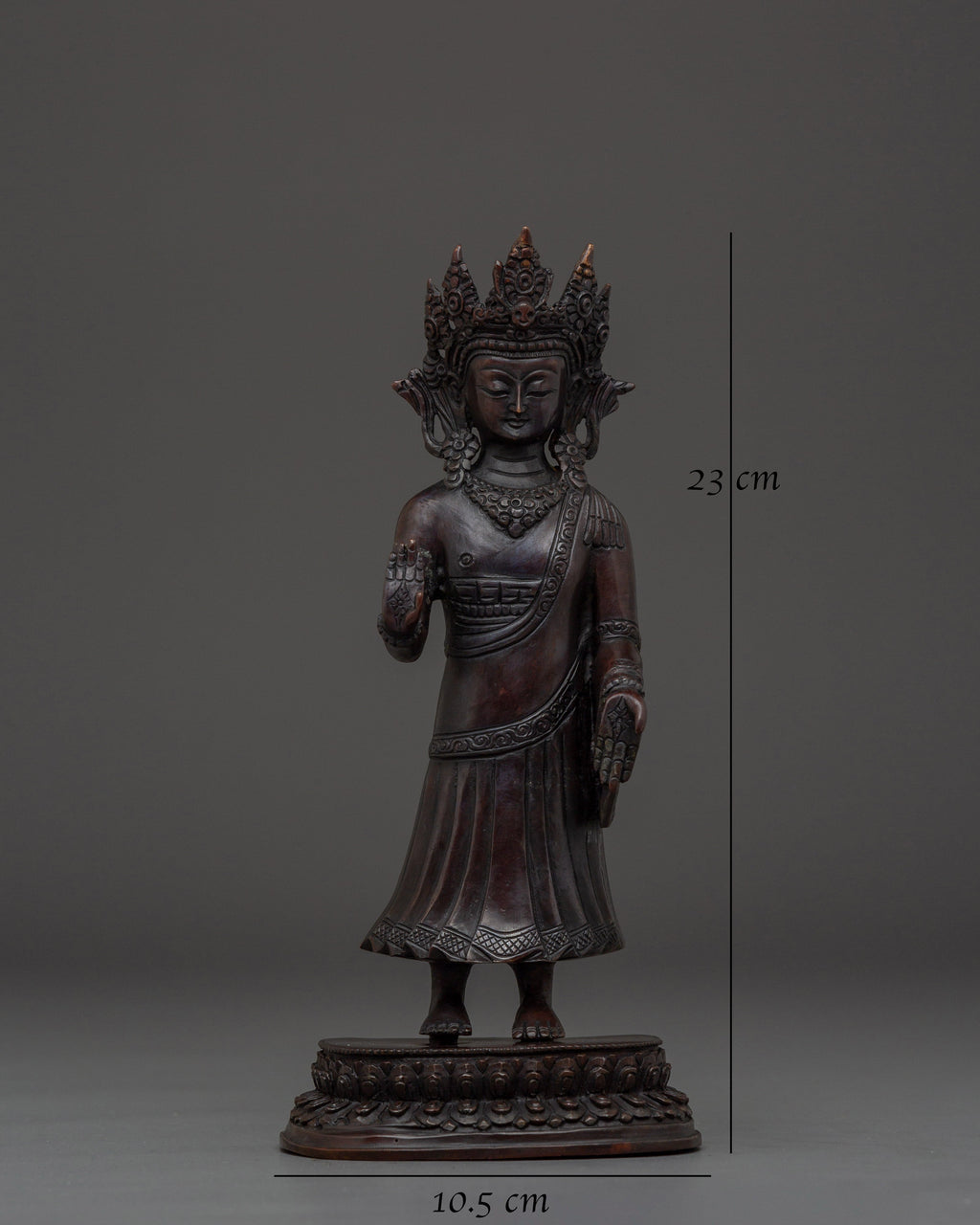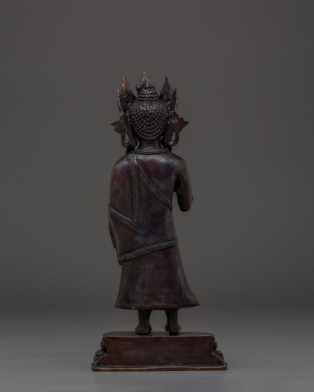 This Standing Buddha Copper Statue is a beautifully crafted spiritual sculpture, measuring 23cm in height and 10.5cm in width. Made from oxidized copper, it features intricate details that highlight the serene and compassionate posture of the Buddha, making it a striking addition to any sacred space or home décor.