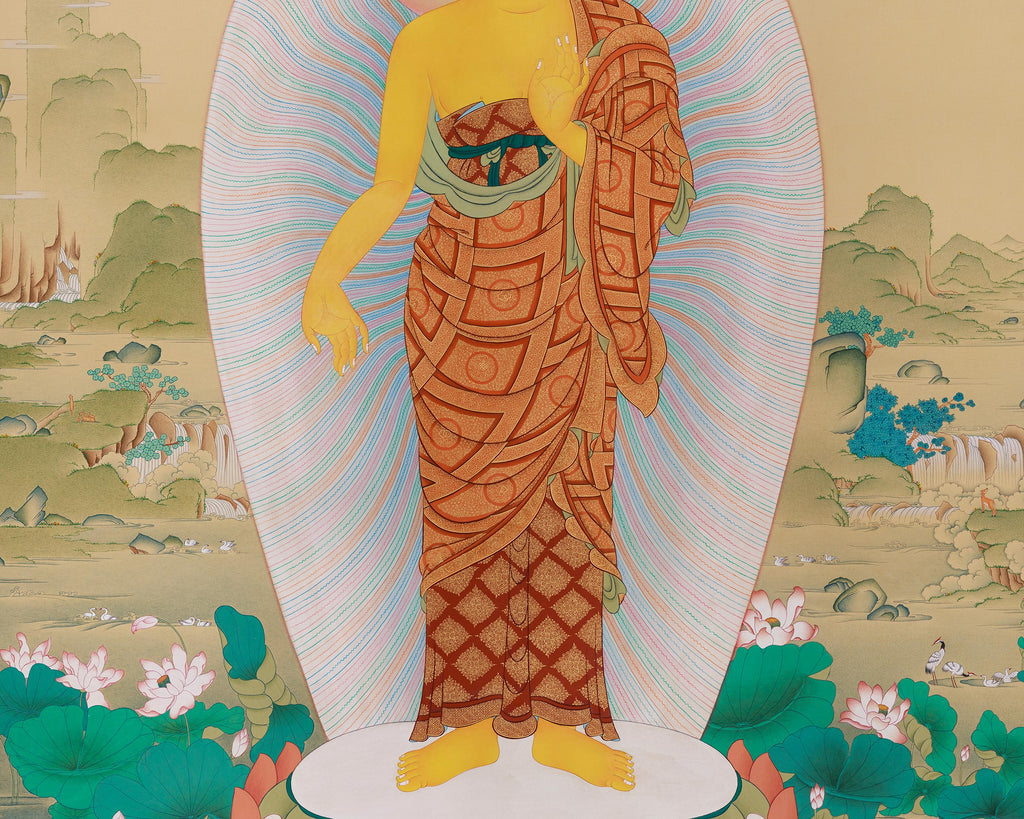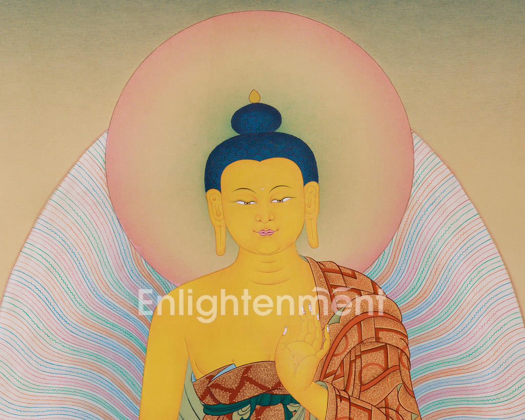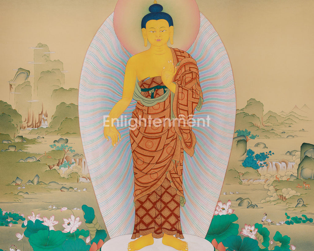 Behold the timeless grace of the Standing Historical Buddha Shakyamuni, captured in a mesmerizing blend of natural Lhasa stone colors and radiant 24K gold. This exquisite thangka is not merely an artwork but a spiritual gateway to the Buddha’s enlightened state, meticulously hand-painted on premium cotton canvas in the traditional Karma Gadri style. Every brushstroke brings the Buddha's serene presence to life, with luminous gold enhancing his divine qualities and natural stone hues evoking a deep sense of peace and harmony.