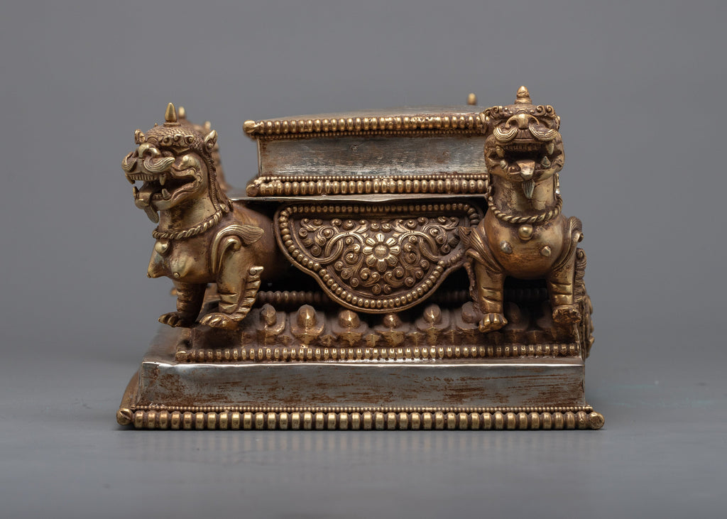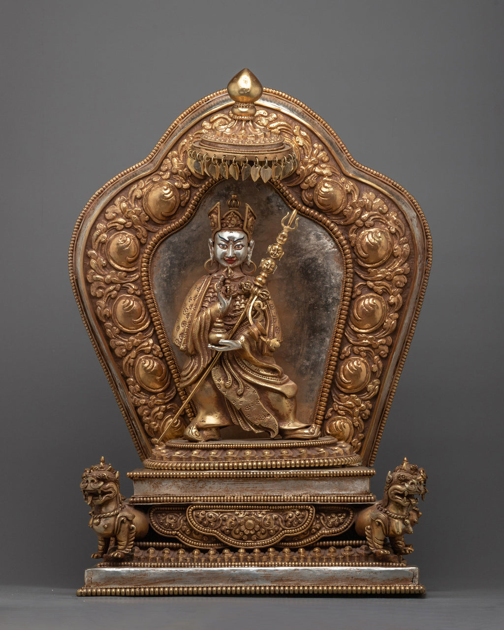 Behold the divine artistry of our Standing Tantric Guru Rinpoche Statue, which has been masterfully crafted to perfection. With its 24K gold gilding and copper construction, this statue exudes a sense of spiritual elegance and grandeur. The minute details, which are accentuated by acrylic paints, demonstrate our artists' skill and dedication. Guru Rinpoche's compassion and ageless wisdom are reflected in every brushstroke and intricate craftsmanship. The statue's celestial attractiveness is enhanced by its finely carved halo and delicately created throne, which is embellished with four snow lions, which are symbolic of auspiciousness.s