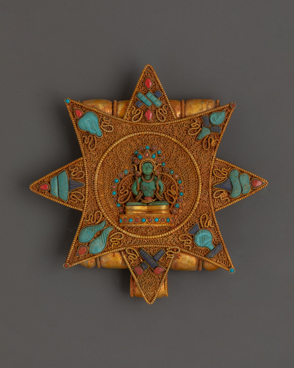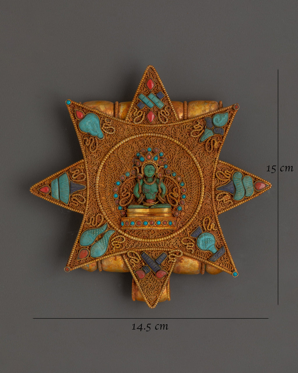 This Star-Shaped Ghau Box Locket is a stunning, handcrafted Tibetan spiritual pendant featuring delicate filigree work and rich copper and gold plating. Its height of 15cm and width of 14.5cm make it a remarkable item, perfect for those seeking distinctive and significant jewelry. This locket, made of turquoise and coral stones. The star-shaped design contributes to its visual appeal. At the same time, the engraved Tara Goddess inside the ghau box, together with distinctive symbols, adds a strong spiritual meaning, representing protection and enlightenment.