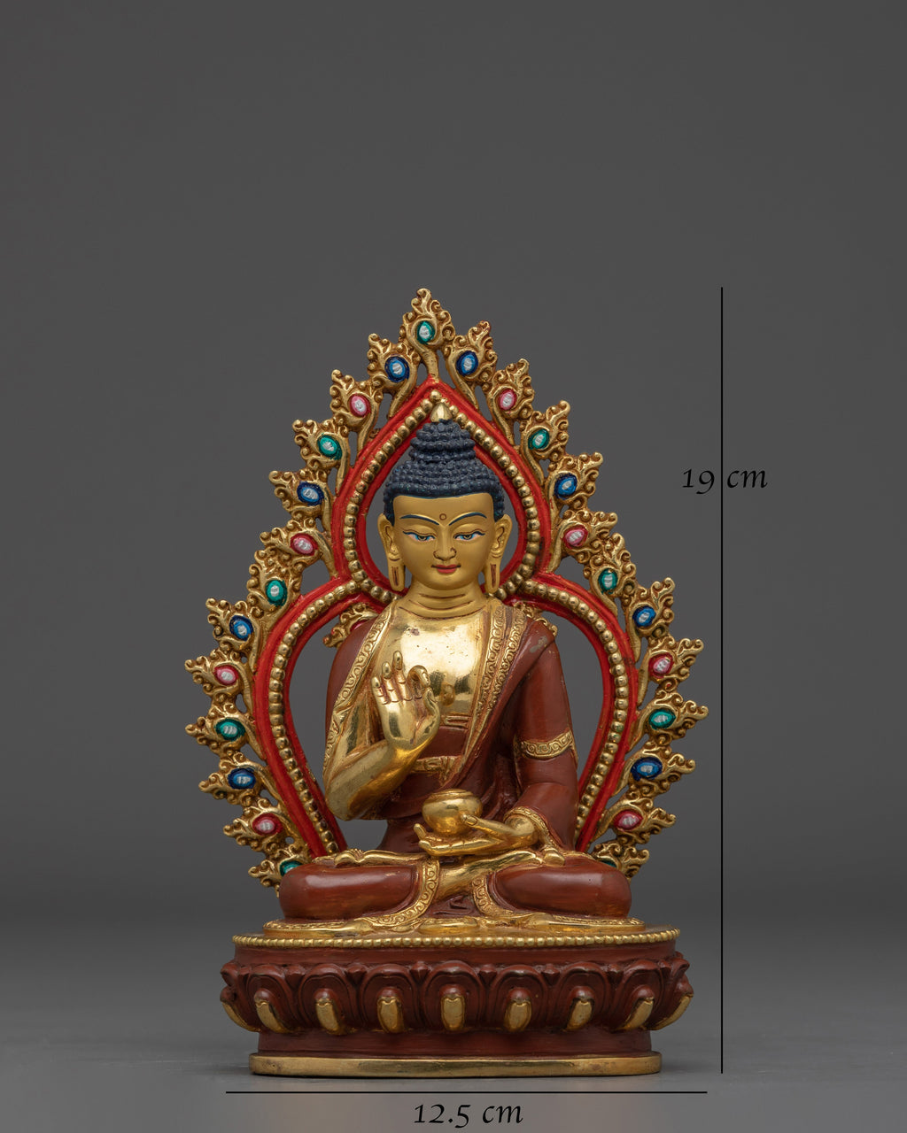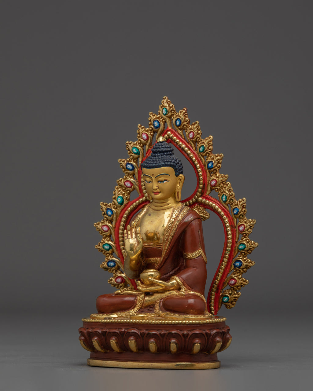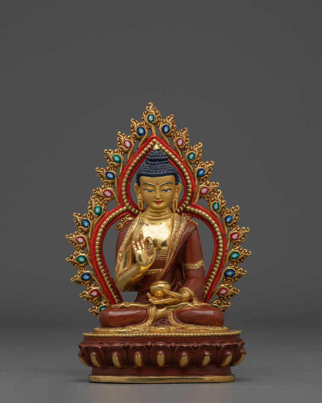 The statue's holy presence is enhanced by its gold-plated copper body, and the vivid gemstones embellishing the halo signify the Buddha's five wisdoms. The intricately crafted lotus base symbolizes purity, while the red and green accents represent balance and harmony. This Amoghasiddhi Buddha statue is a valuable addition to any altar, meditation place, or home shrine, representing achievement, overcoming obstacles, and spiritual fulfillment.