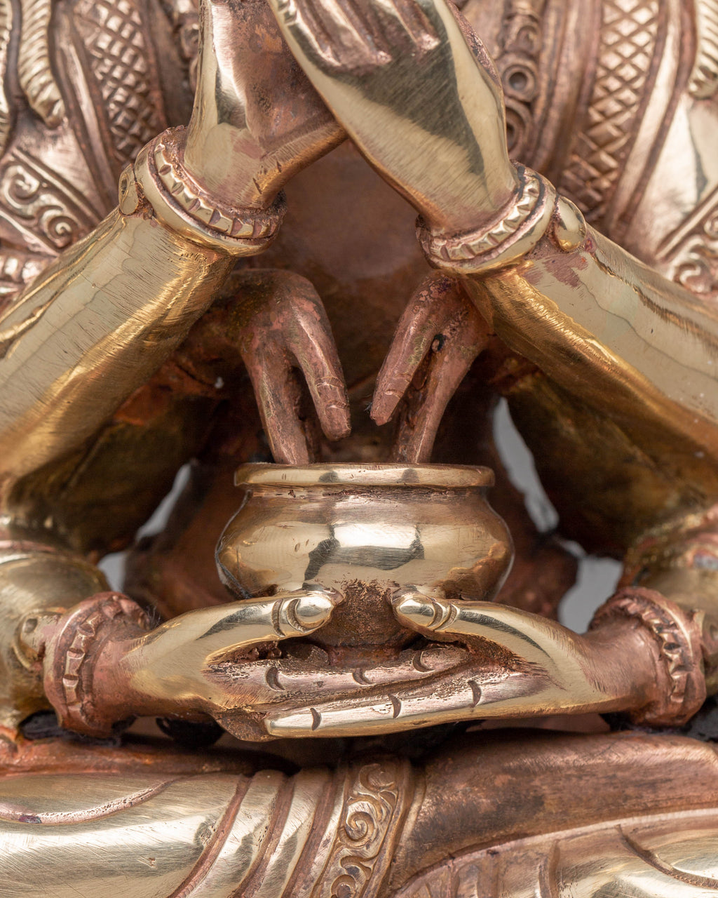 The Chundi statue is depicted in her fierce, protective form, embodying the power to conquer harmful forces and provide divine protection. The copper body brings out the rich detailing of her attire and ornaments, including her crown and intricate jewelry. Her posture and expression convey strength, courage, and a readiness to defend against evil. The detailed design highlights her role as a protector and spiritual warrior, offering blessings to those who seek her protection. The symbolism of Chundi reflects not only physical security but also emotional and spiritual strength, making her a revered figure in Tibetan Buddhist rituals.