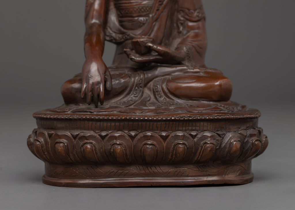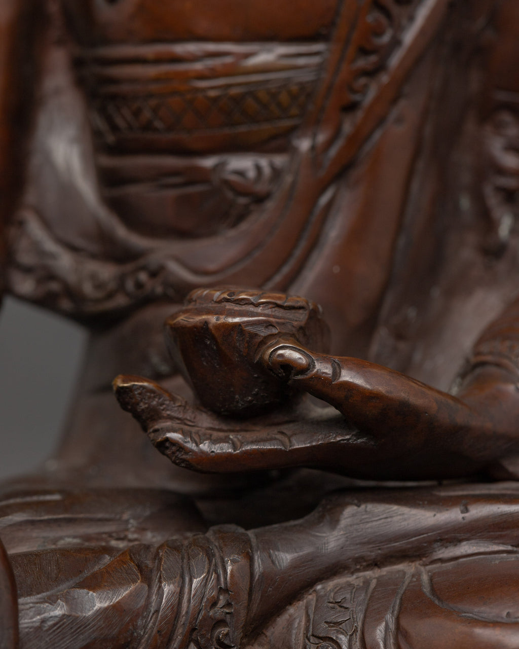The Statue of Crown Shakyamuni Buddha, handcrafted with care to detail, displays the Buddha's flowing robes, symbolic hand motions, and exquisite patterns on the crown, underlining his hallowed presence. The rusted copper body adds to the statue's visual depth and spiritual atmosphere, emphasizing its craftsmanship and traditional Tibetan artistic traditions. Displaying this image in your environment promotes awareness, devotion, and a closer connection to Shakyamuni Buddha's teachings.