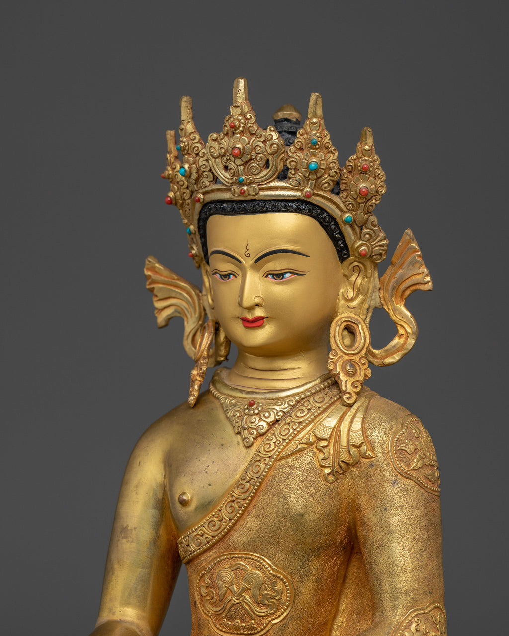 The statue of Crown Shakyamuni Buddha stands 12” (30.5cm) tall with a base width of 10” (25.5 cm) and weighs 3.97 kg. It is crafted from a copper body, 24K gold gilding, detailed gold and acrylic paintings, and crowned with a traditional five‑pointed diadem. This serene yet majestic depiction of the historical Buddha combines regal iconography with masterful artisan work, making it a striking focal point for any altar, meditation space, or sacred collection.
