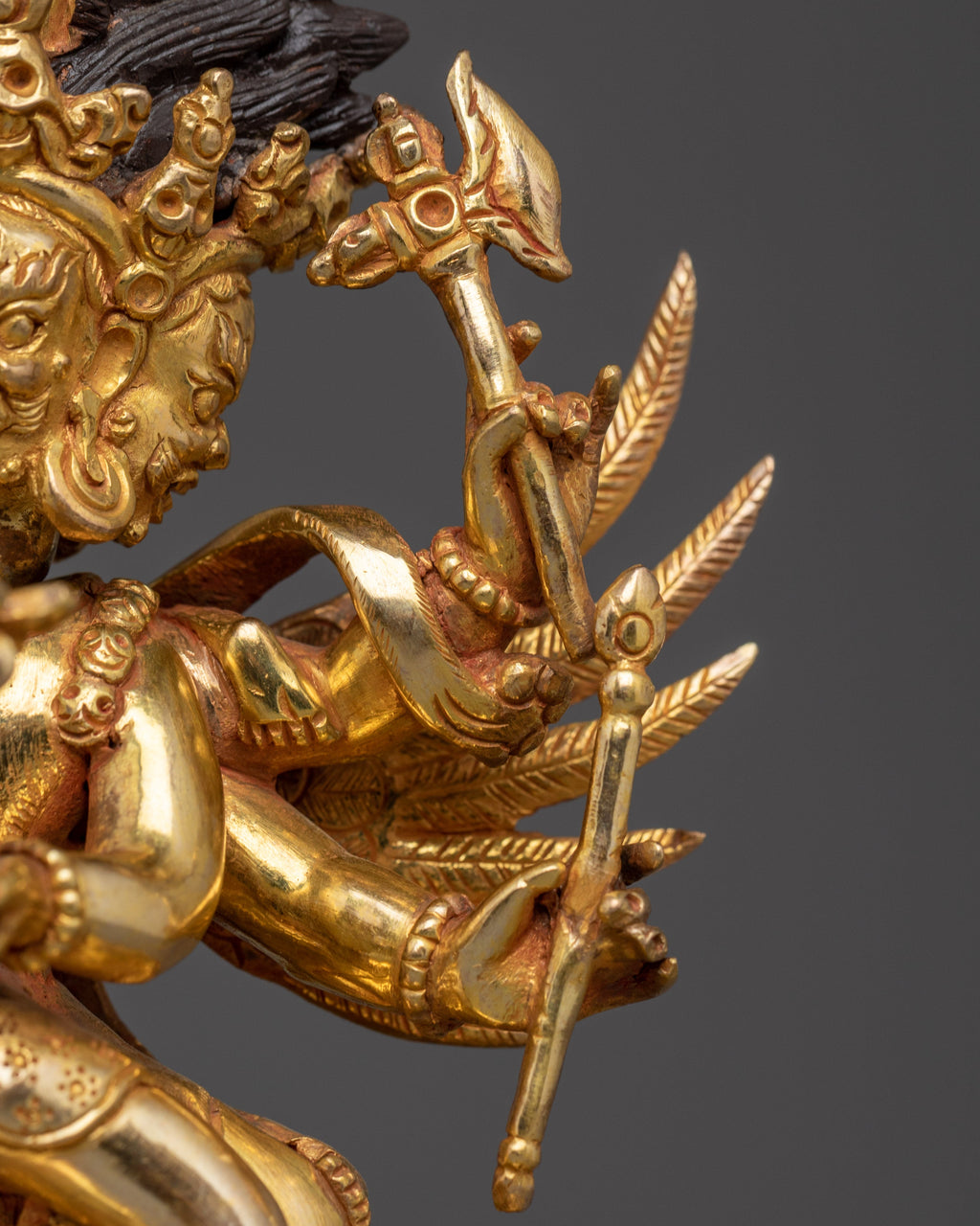Hayagrīva is the wrathful form of Avalokiteshvara, embodying fierce compassion that destroys delusion and overcomes internal and external obstacles. His wrathful appearance symbolizes the intense, active energy needed to eliminate ignorance and negative forces. A distinctive iconographic feature of Hayagrīva is the horse head that emerges from the top of his crown. This horse head represents the mighty, penetrating roar of Dharma—the enlightened speech that dispels illusion and ignorance. The neigh or scream of the horse is symbolic of the transformative, liberating sound of Dharma, capable of reaching all beings and cutting through delusion. In his right hand, Hayagrīva holds a lasso (pāśa), used to bind and subdue harmful forces and negative emotions, drawing them under control and transforming them into wisdom. In his Lower right hand, he holds a sword, which signifies the cutting of ignorance, delusion, and obstacles. The sword is a classic symbol in Buddhist iconography, representing wisdom that cuts through confusion and negativity. These implements reinforce Hayagrīva's role as the eliminator of delusion and protector against harmful influences.