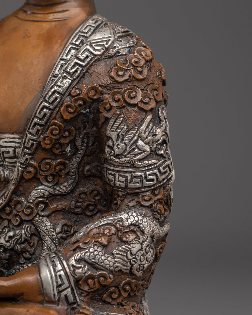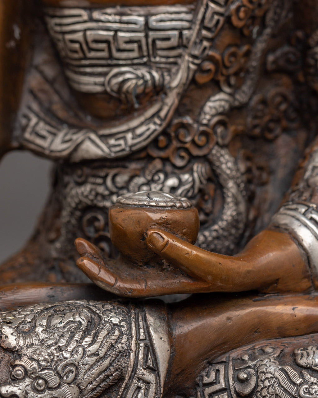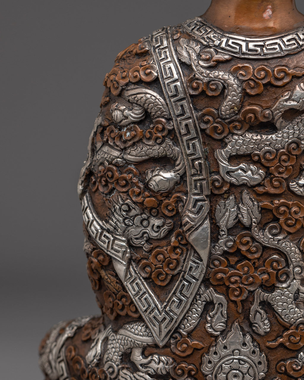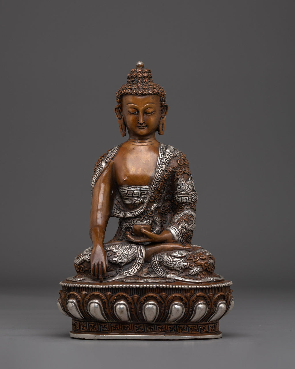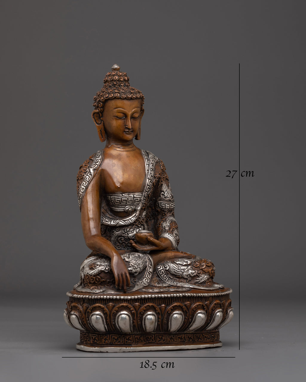 This Handmade Oxidized Copper Statue of Historical Gautama Buddha measures 10.6 inches (27 cm) in height and 7.3 inches (18.5 cm) at the base, with a weight of 2.62 kg. Expertly crafted from oxidized copper and finished with a layer of silver plating, the statue reflects the refined skills of Nepali artisans. Its aged, dignified appearance and meticulous detailing make it a striking addition to meditation spaces, home altars, or spiritual interiors—inviting a sense of calm, mindfulness, and timeless beauty into any environment.