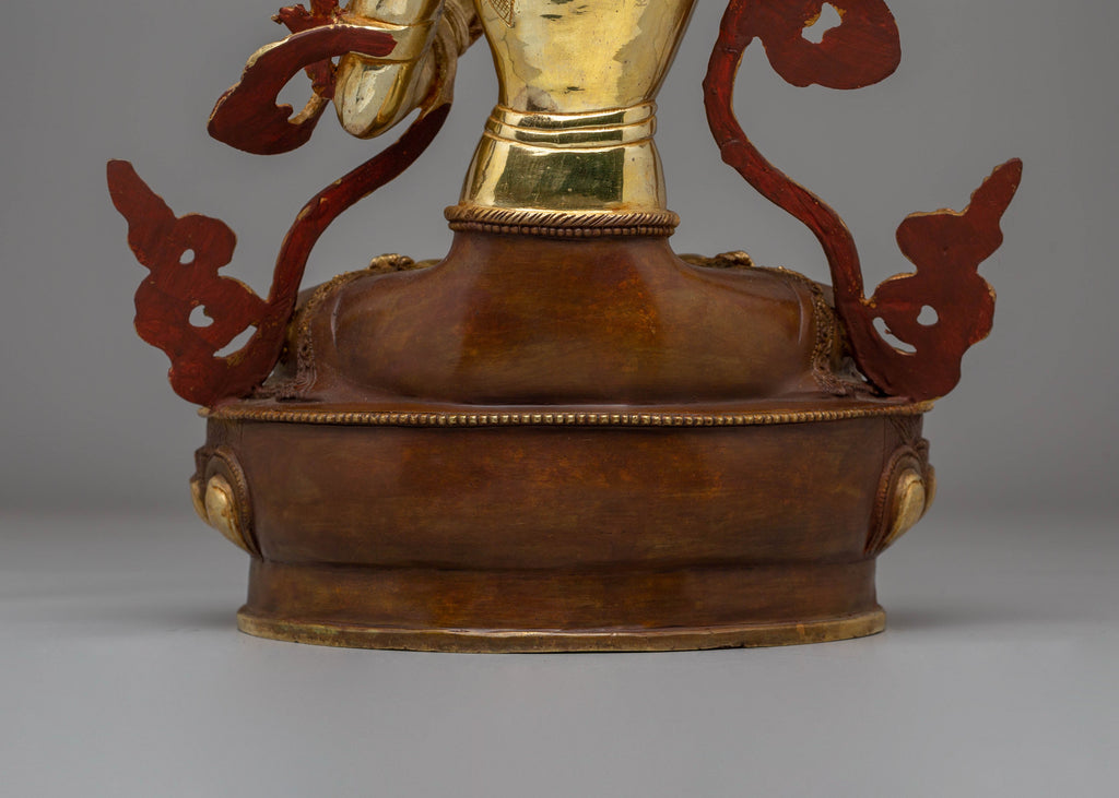 The intricate craftsmanship captures the serene expression and divine aura of Manjushri, radiating spiritual energy and enlightenment. The gold-plated finish enhances the statue's brilliance, while the acrylic color accents highlight the delicate features and symbolic motifs. This statue serves as both a powerful spiritual tool and a beautiful decorative piece, ideal for meditation spaces, altars, or sacred corners of your home. Its presence fosters clarity, wisdom, and spiritual growth, making it a valuable addition to any space dedicated to mindfulness and inner peace.