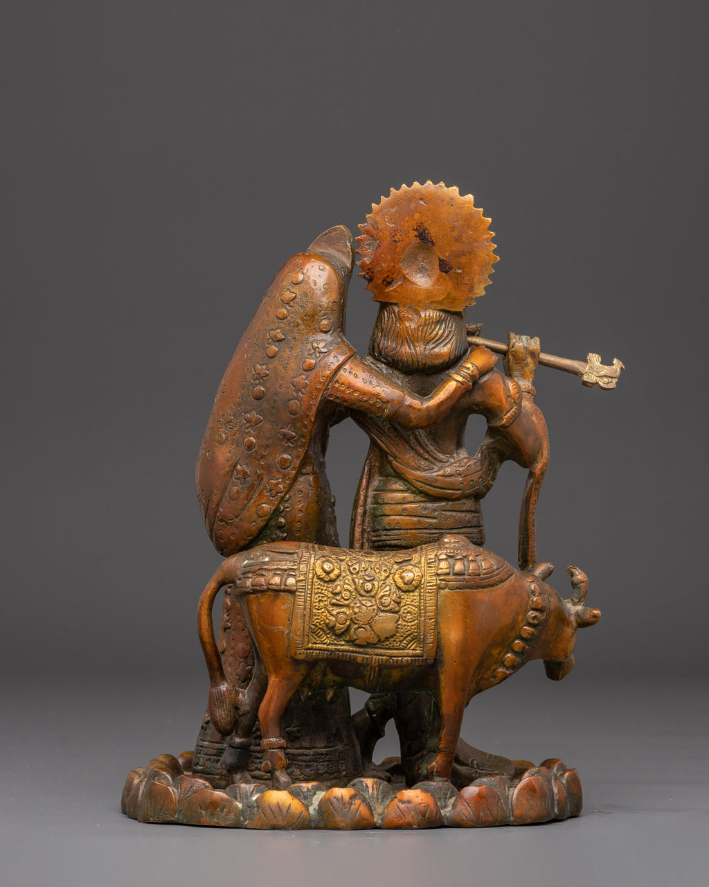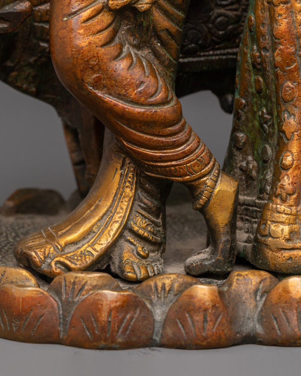 The intricate detailing on their jewelry, crowns, and garments reflects the artistry found in traditional Indian metalwork. Krishna’s serene stance paired with Radha’s poised elegance showcases the divine bond that represents cosmic harmony and pure devotion. From the fine engravings to the ornamental base, every element has been thoughtfully shaped to bring richness, charm, and spiritual depth to the piece. This statue stands as a testament to devotion, romance, and the transcendence of the soul through divine love.