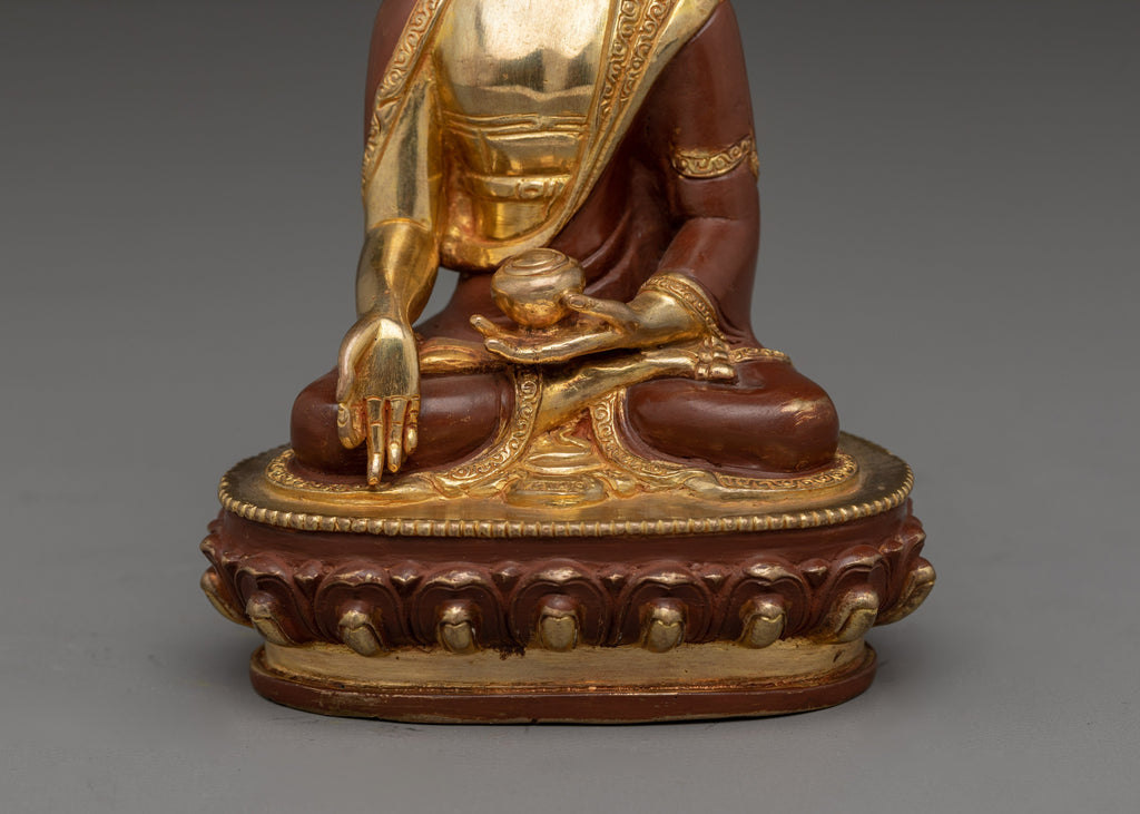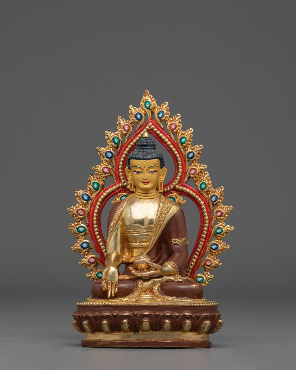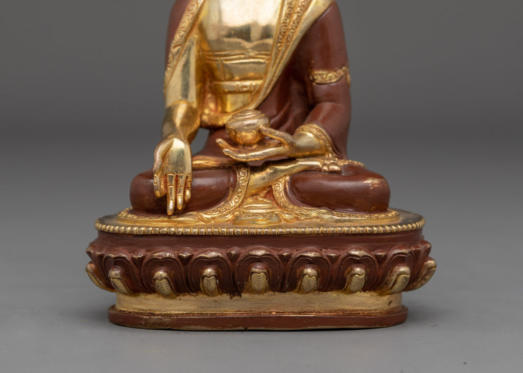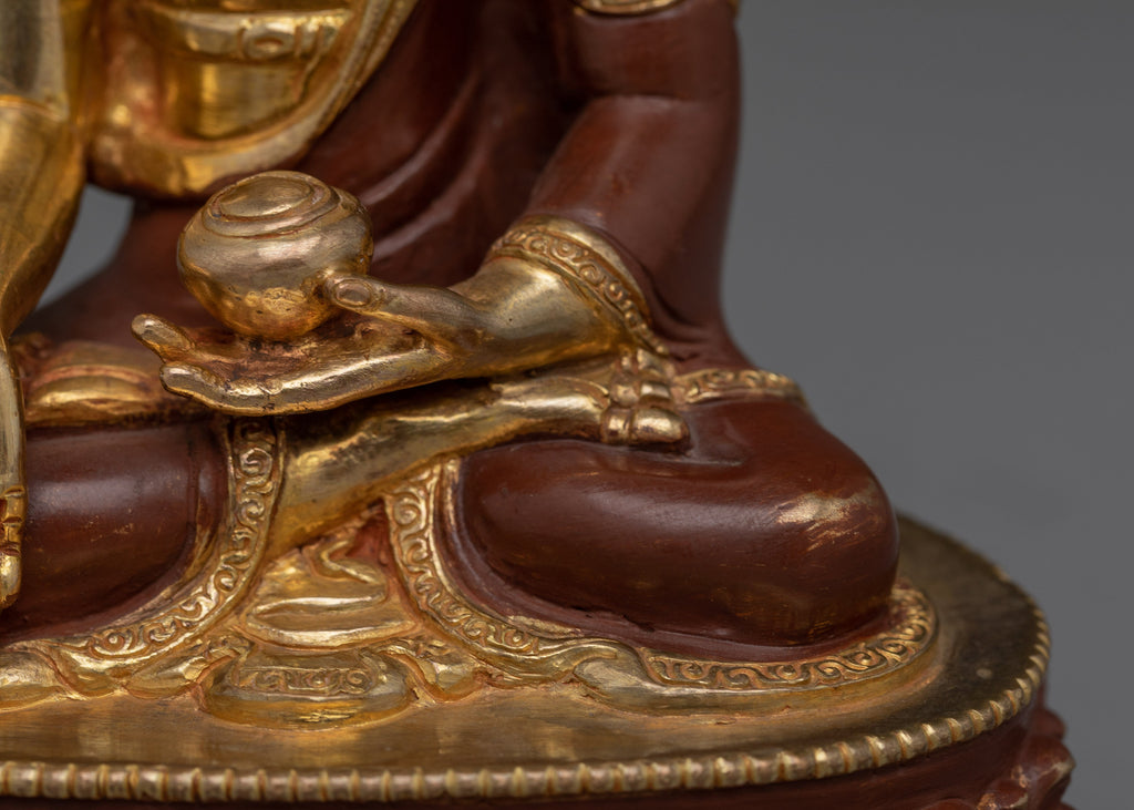 The exquisite gold-plated copper body and gemstones surrounding the halo enhance the symbolism of Ratnasambhava's qualities—the golden color represents the purity of wisdom. At the same time, the ornate embellishments and gems signify the blessings he bestows upon his followers. This Buddha statue is an excellent centerpiece for meditation rooms, shrines, and spiritual spaces, reminding practitioners of the values of compassion, kindness, and wisdom.