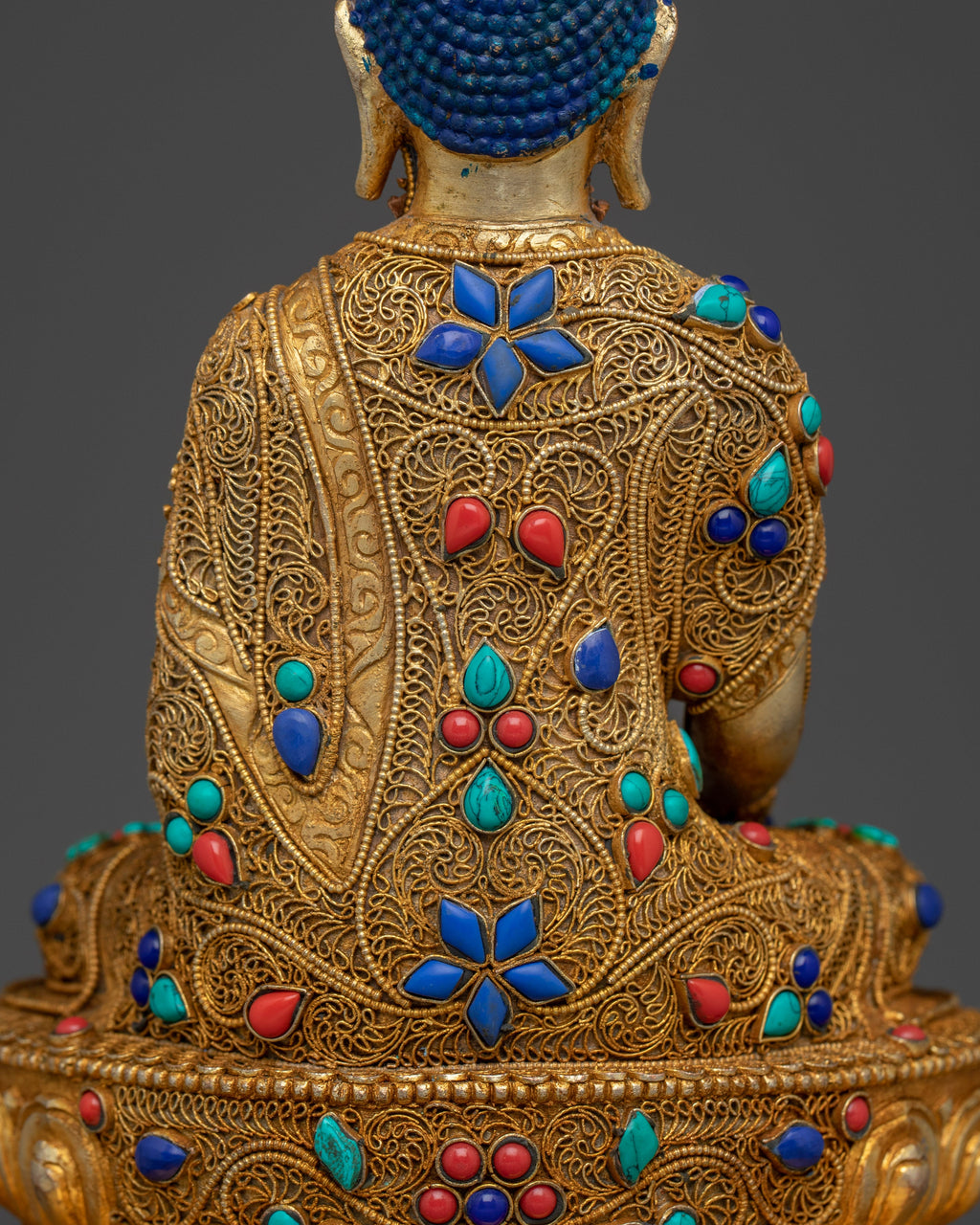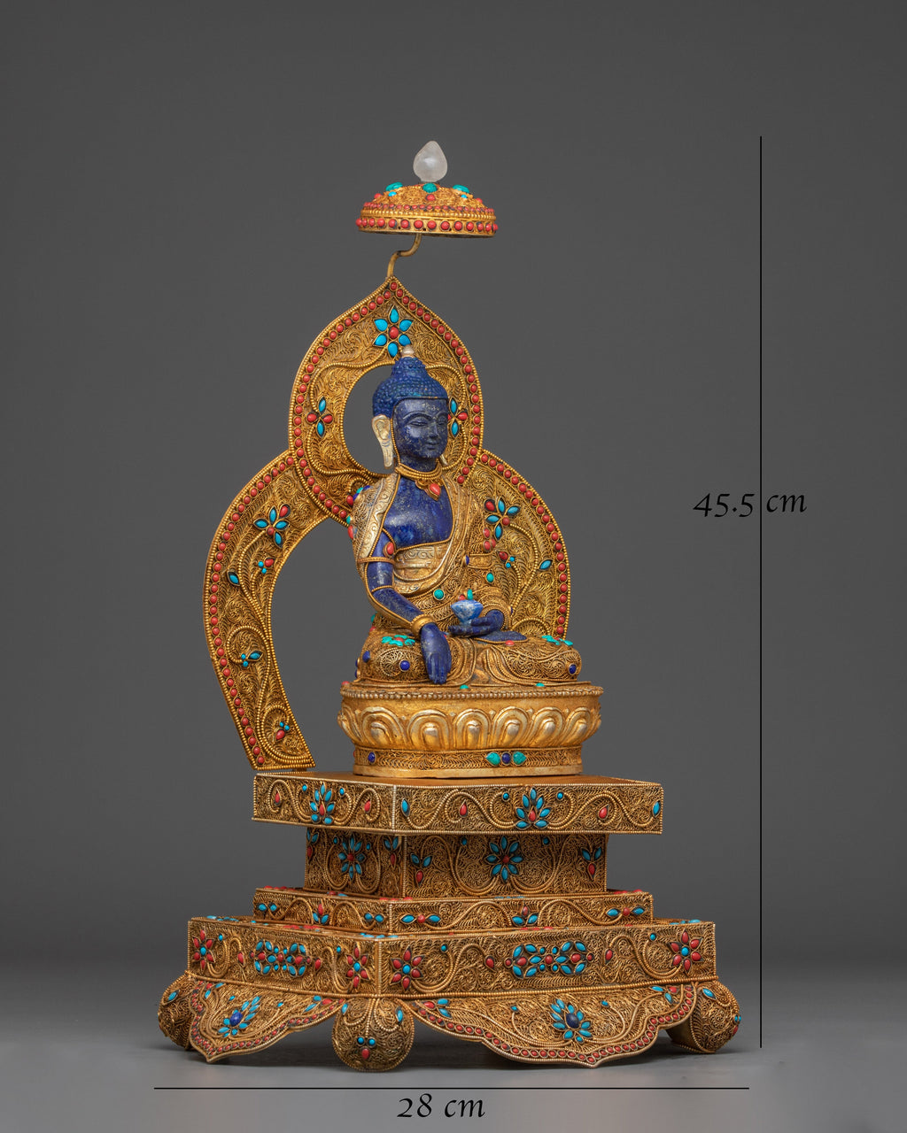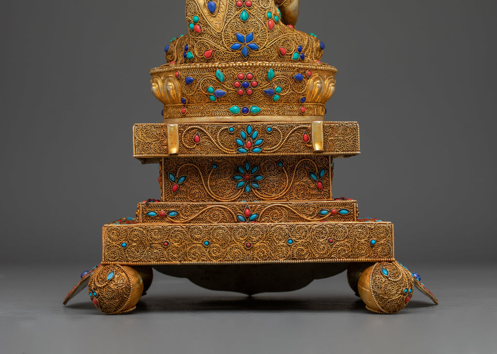 This handcrafted statue of Shakyamuni Buddha on a beautiful throne is gilded with 24K gold and adorned with gold and acrylic paintings, as well as handcarved gemstones. At 17.9" tall and weighing 3.17 kg, this statue is a stunning and unique addition to any home or worship space.