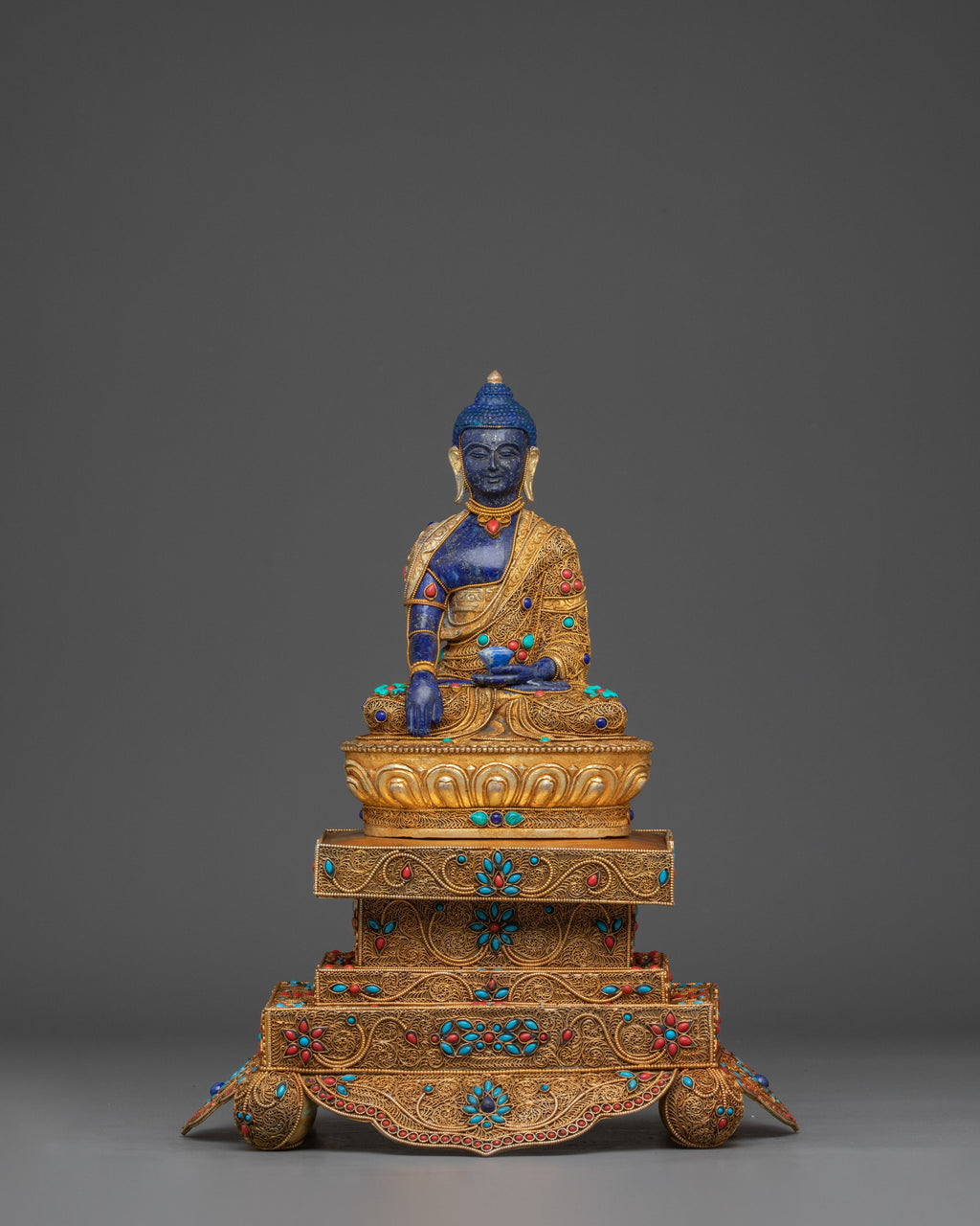 The Shakyamuni statue is depicted seated on an exquisitely designed throne, embodying serenity and divine grace. The throne itself is a work of art, symbolizing reverence and sanctity. It is adorned with intricate carvings and auspicious symbols, representing the profound teachings of Buddhism. Often embellished with vibrant acrylic paintings, the throne highlights the skill of master artisans who bring it to life with intricate detailing and symmetrical patterns. Shakyamuni Buddha is meditating with a blue body, which is said to help transform negative emotions, especially anger, into wisdom and intelligence. In the system of the Five Pure Lights (Pancha-varna), blue is linked to the element of air and the sense of hearing (the ears).