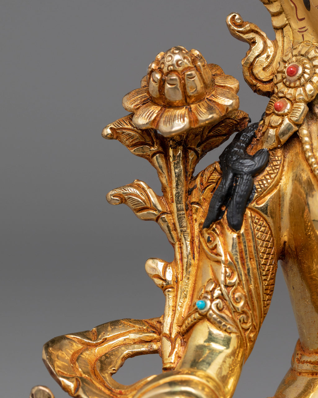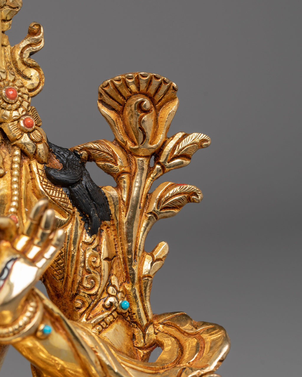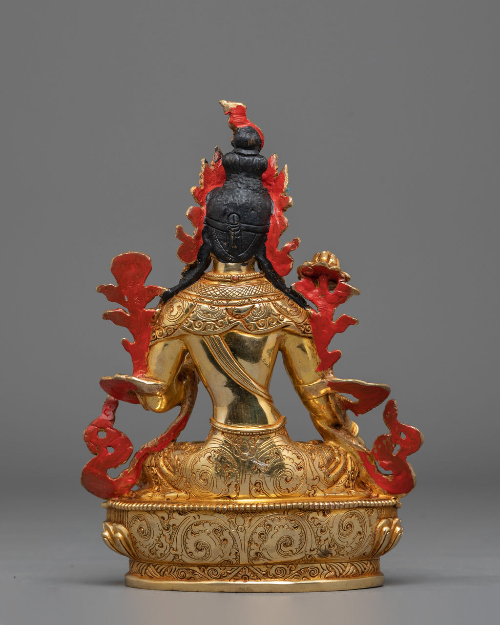 The artificial stone accents of coral and turquoise, embedded in the statue, enhance the divine beauty and symbolism of White Tara. Coral is believed to have protective qualities, while turquoise represents spiritual health and vitality, amplifying Tara's nurturing energy. The intricacy of the gold-plated details, combined with Tara’s graceful and compassionate posture, makes this statue a powerful reminder of the goddess’s healing powers and her role as a protector of life and well-being.