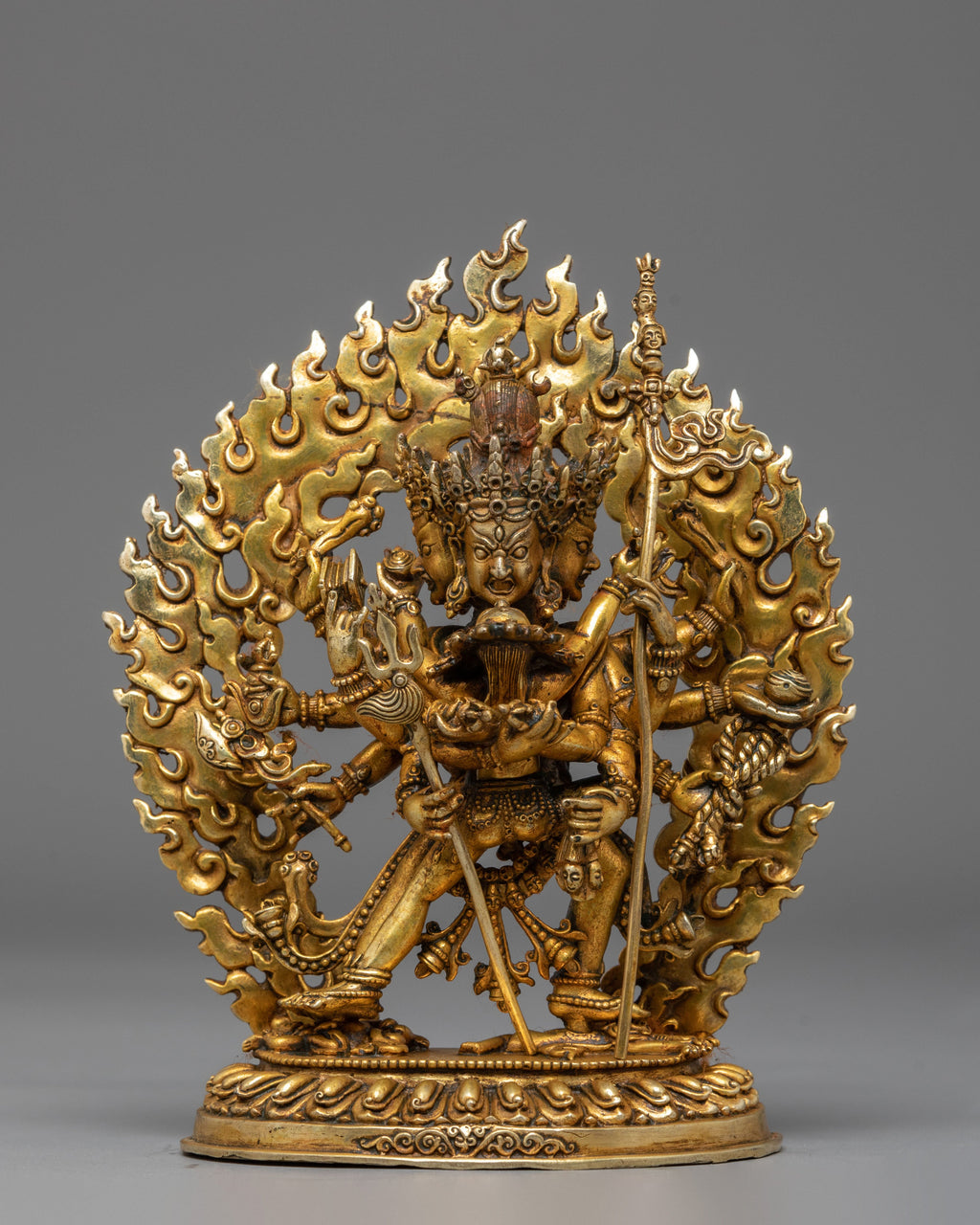 Chakrasambhara is a Tantric deity known for his role in the profound practice of union and transformation. His image is often associated with the dynamic energy of the body, speech, and mind, guiding practitioners toward enlightenment. The Chakrasambhara Statue depicts the deity in an intimate embrace with his consort, symbolizing the balance of masculine and feminine energies. The gold plating reflects the divine light and purity of Chakrasambhara, elevating the energy of the figure and infusing any space with spiritual power. This Chakrasambhara Statue is more than just a decorative piece; it serves as a potent symbol of Tantric wisdom and the path to spiritual transformation. Crafted from copper and finished with gold plating, it embodies the essence of sacred union and the profound teachings of Chakrasambhara. Ideal for meditation, prayer, or as an addition to your Buddhist altar, this statue channels the deity’s transformative energy.