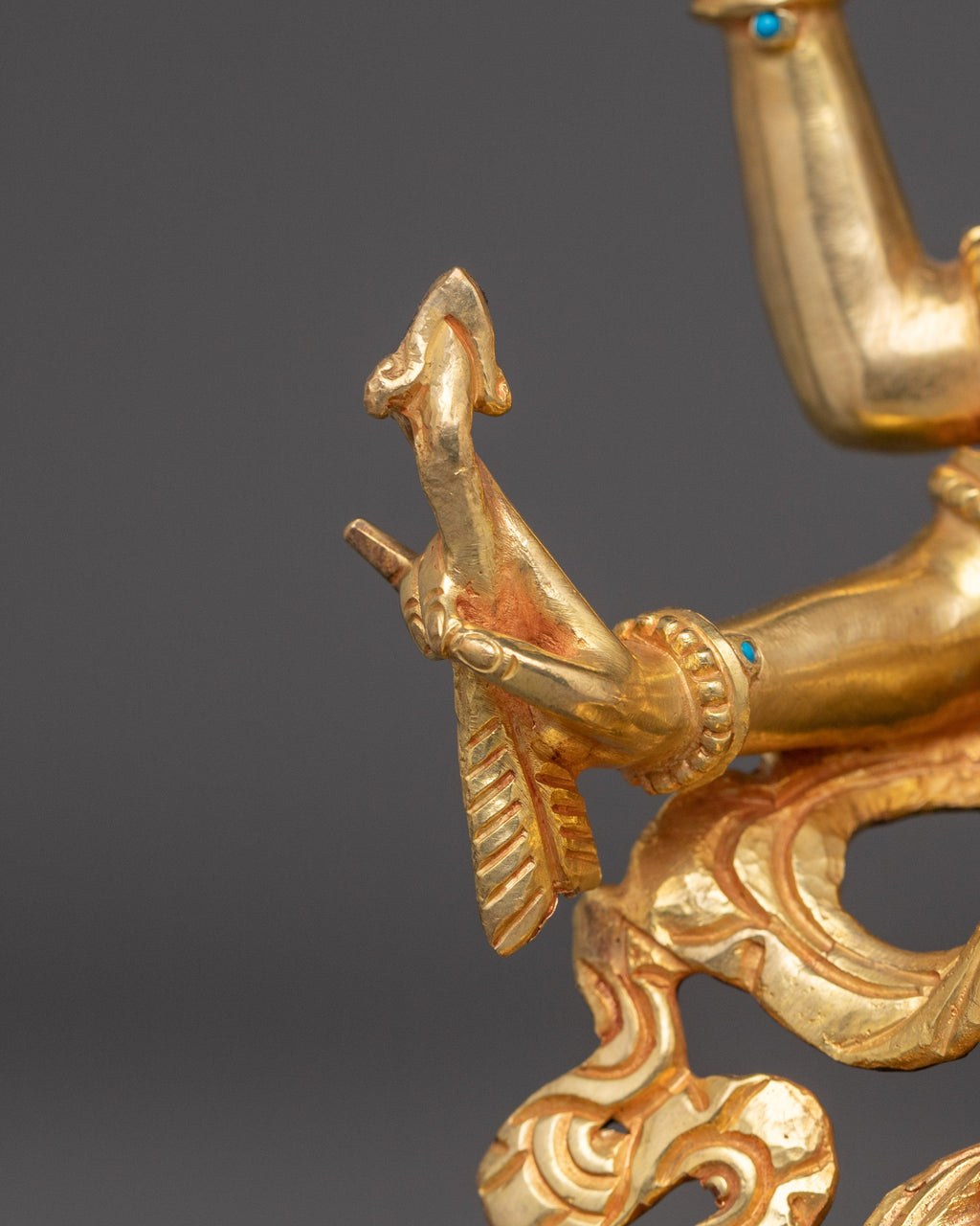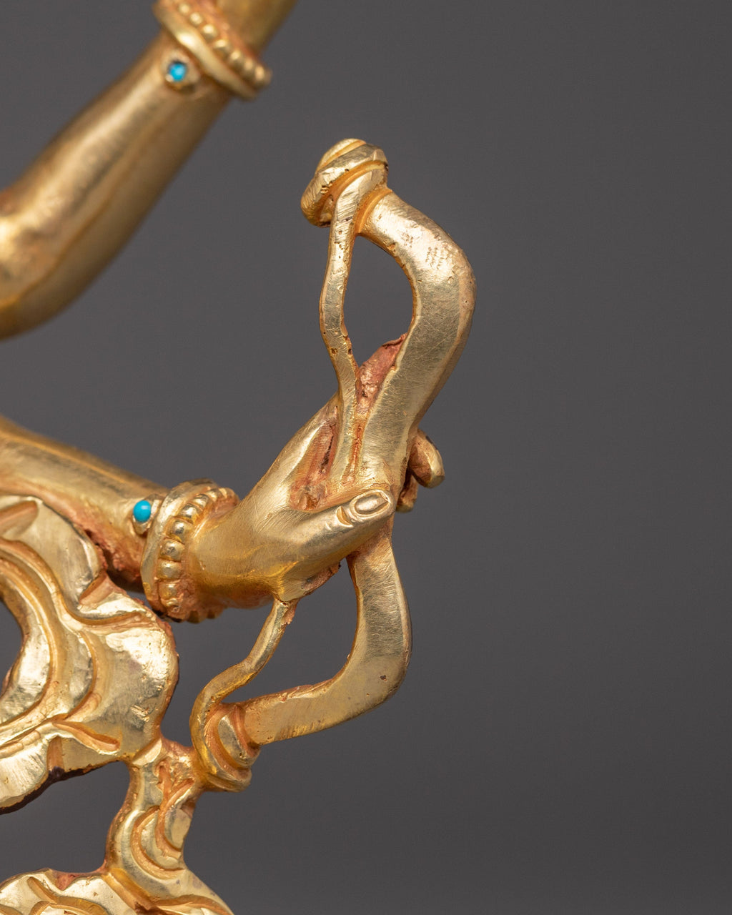 This Namgyalma statue, also known as the Ushnishavijaya, stands at a height of 8.7 inches (22 cm) with a base width of 7.7 inches (19.5 cm) and weighs 2.26 kg. Crafted from a copper body, the statue is 24K gold gilded with intricate gold and acrylic paintings, which enhance its spiritual elegance. It is further adorned with gemstones, adding a touch of divine beauty. This expertly detailed piece, crafted by skilled Nepali artisans, is ideal for home altars or sacred décor, serving as a powerful symbol of spiritual renewal and protection.