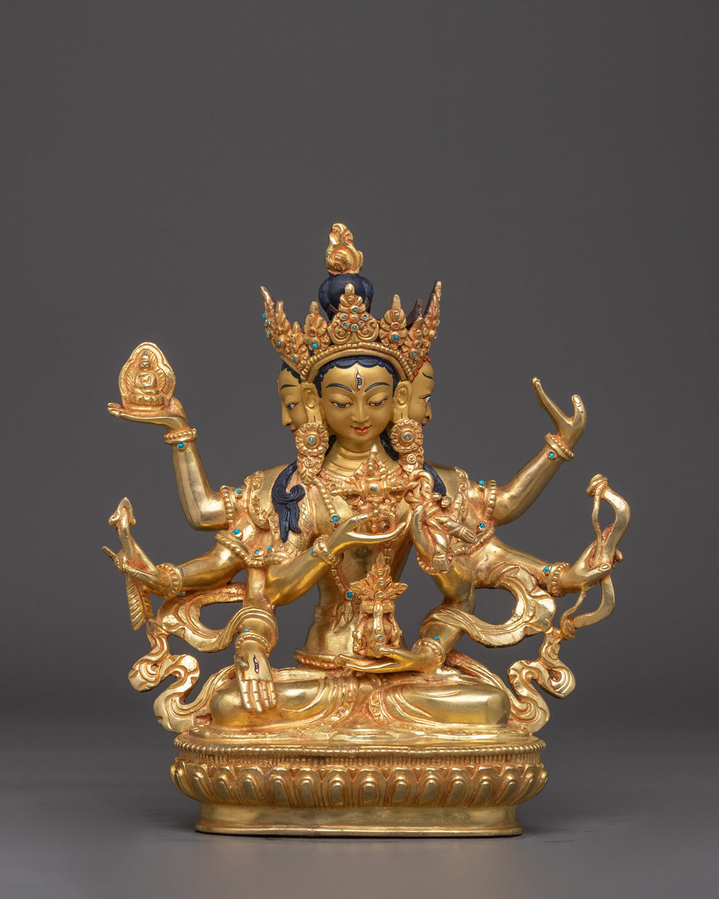 Namgyalma, also known as Ushnisha Vijaya, is a Mahayana and Vajrayana Buddhist deity praised for her ability to provide longevity, vanquish death, and purify negative karma. She has three faces and eight arms, each having symbolic traits that indicate her power to protect practitioners from various perils and extend their lives. Namgyalma's practice is especially revered for its ability to improve health, longevity, and mental purity. This statue is a powerful manifestation of these virtues, serving as a constant reminder of the possibility of spiritual growth and rejuvenation.