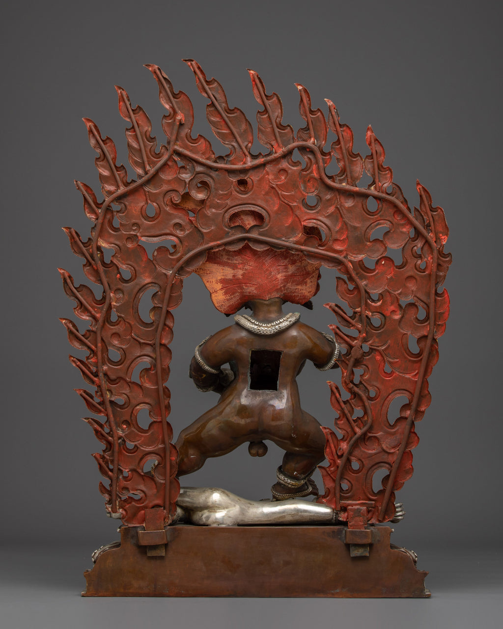Vajrayana Black Dzambhala Statue is expertly handcrafted from an oxidized copper body, accented with silver plating and vibrant acrylic paintings. Measuring 23.0”/58.5cm in height and 16.7”/42.5cm at the base, it weighs 10.52 kg. Known as the wrathful manifestation of the Buddhist wealth deity, Black Dzambhala is revered for protecting against poverty and attracting abundance through fierce compassion. This commanding statue is a striking addition to any altar, meditation room, or sacred space dedicated to spiritual and material prosperity.