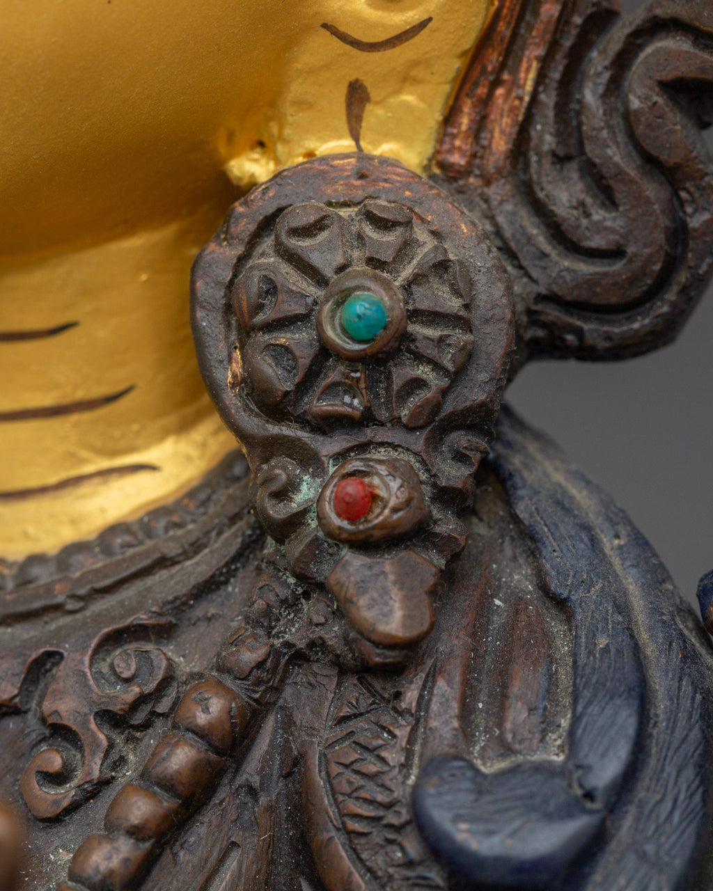 This White Tara statue is depicted with seven eyes, symbolizing her all-seeing compassion and vigilance over sentient beings. Seated in padmasana atop a lotus base, she embodies purity and spiritual awakening. Her right hand is in Varda mudra, holding a lotus flower to signify granting blessings, while her left hand also has a lotus, representing spiritual growth and enlightenment. Adorned with a five-pointed crown, she reflects the wisdom of the Five Dhyani Buddhas, radiating serenity, protection, and compassionate energy.