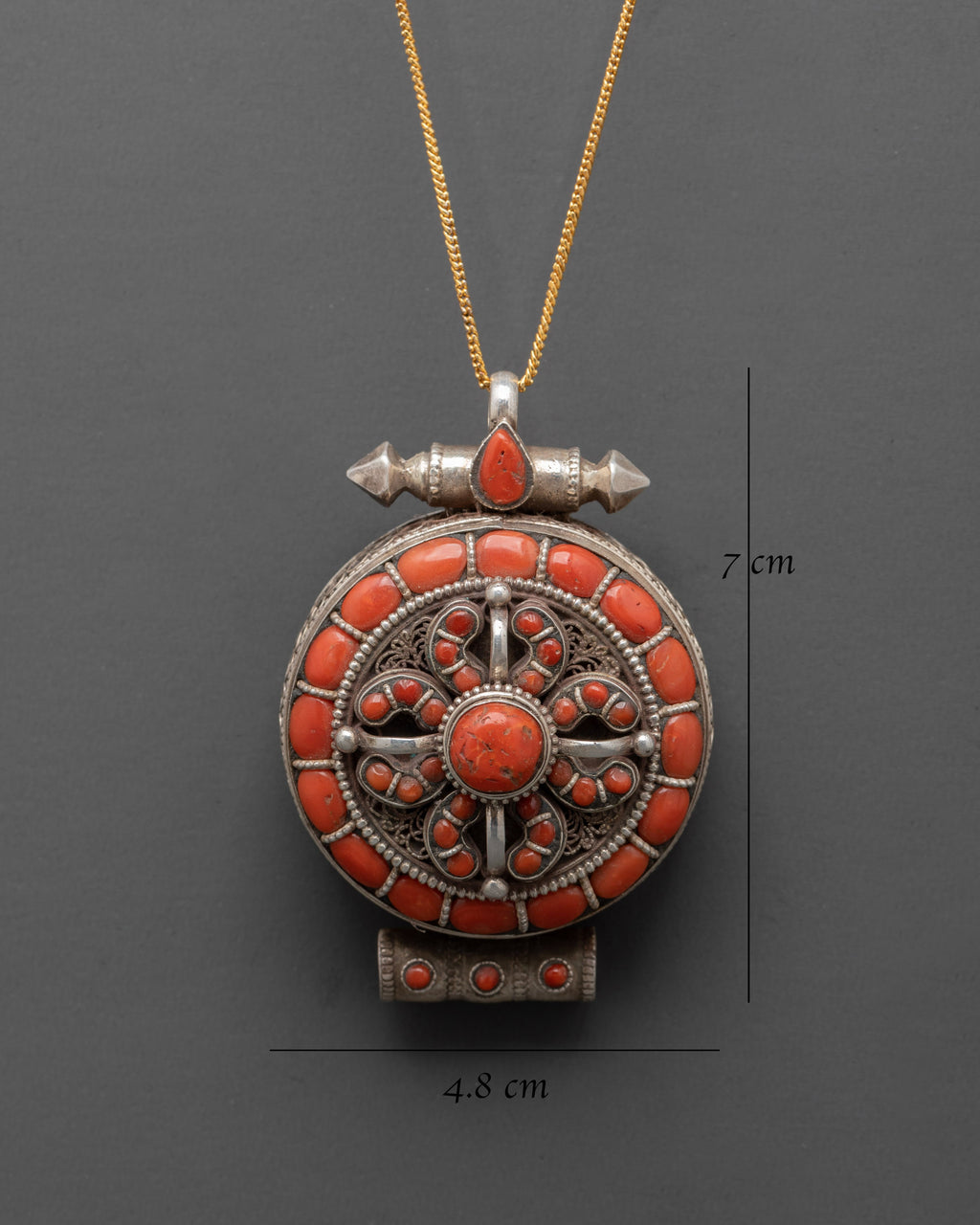 This Sterling Silver Ghau Box Locket with Coral Stone is a stunning handcrafted Tibetan amulet pendant intended to bring spiritual protection, healing, and balance into your life. This gorgeous Buddhist prayer box necklace, measuring 7 cm in height and 4.8 cm in width, is crafted from sterling silver and adorned with a stunning natural coral stone. The locket features an artistically etched Bishwo Vajra (Double Dorje) motif, representing spiritual strength, knowledge, and the balancing of dualities. This powerful symbol is renowned for its protective properties, as well as its ability to draw upon both earthly and celestial energies, making it a vital tool for meditation, mindfulness practices, and spiritual growth.