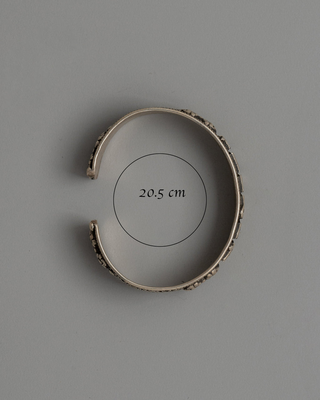 This Sterling Silver Mantra Bracelet, exquisitely written with the sacred Buddhist chant "Om Mani Padme Hum," symbolizes eternal knowledge and spiritual strength. This bracelet, made of 92.5% silver, measures 1.5cm in height and 7cm in width, with finely detailed Sanskrit writing enclosed by lotus designs. At only 0.032kg, this open cuff design is lightweight, making it suitable for regular wear and a daily reminder of compassion, mindfulness, and Divine Protection.