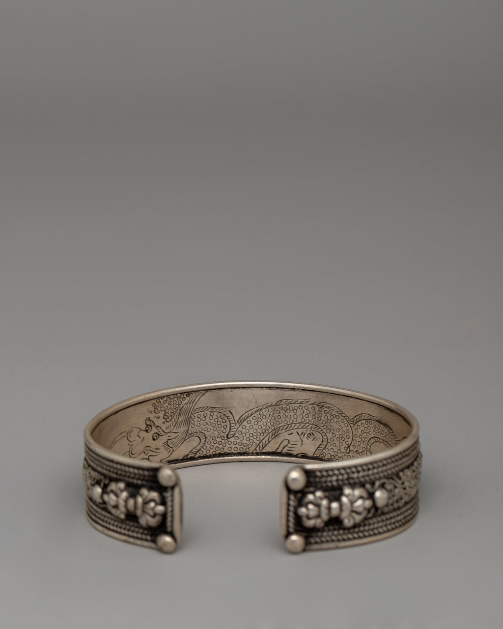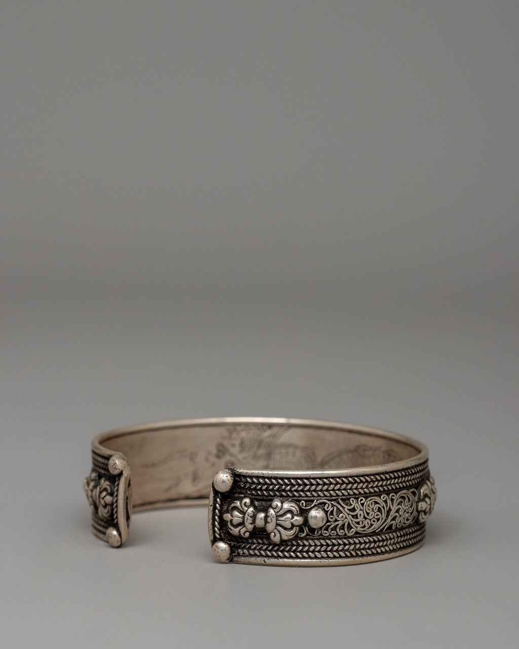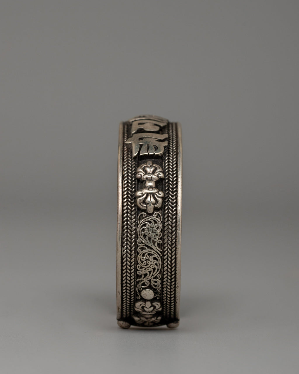 This wide Tibetan mantra bracelet is handcrafted from 92.5% Sterling Silver Om Mani Padme Hum Bracelet and written with the sacred chant "Om Mani Padme Hum." This significant cuff, measuring 2cm in height and 7cm in width, is intended to be both visually appealing and spiritually anchoring. The finely carved phrase is surrounded by floral designs and edged with delicate silver workmanship, making this piece a symbol of compassion, awareness, and spiritual strength.