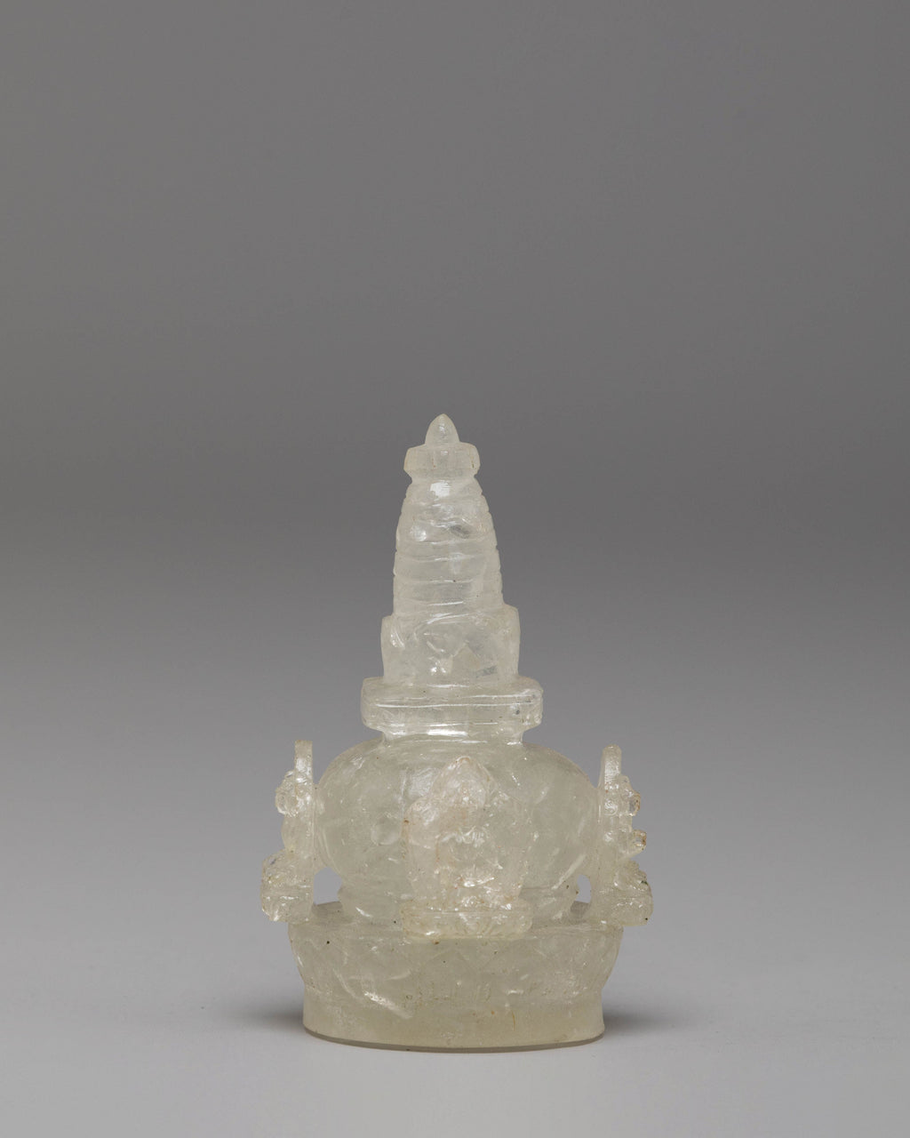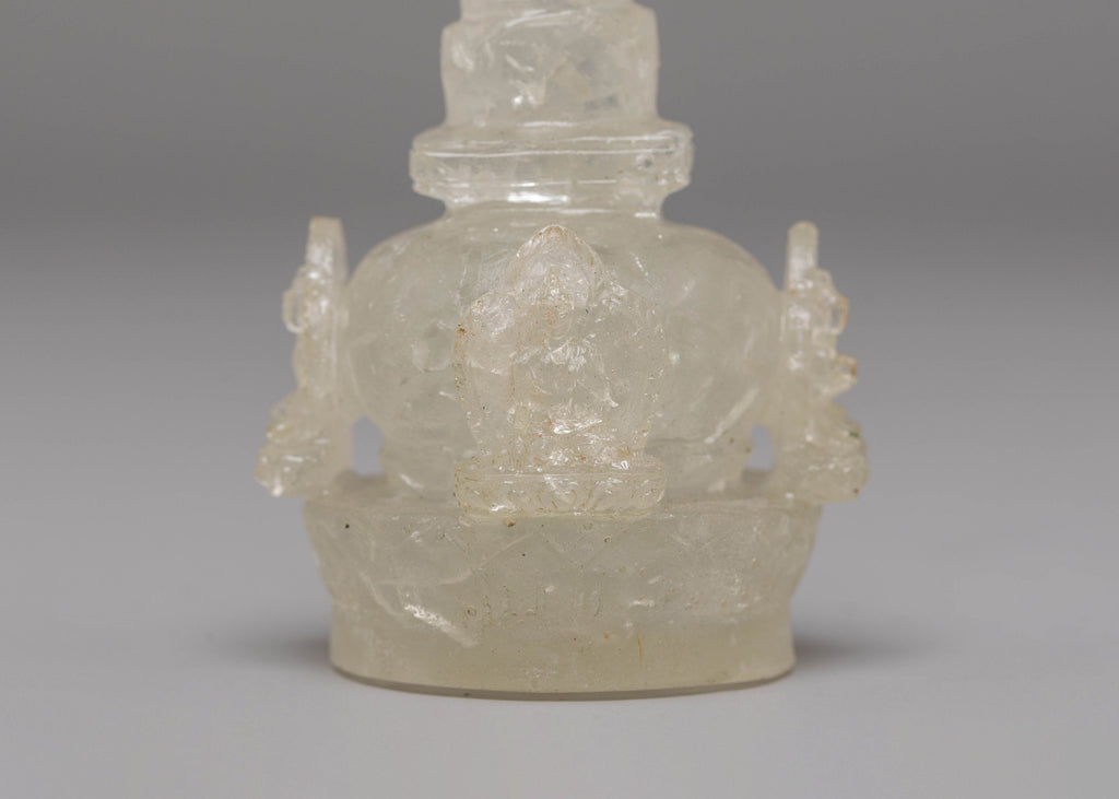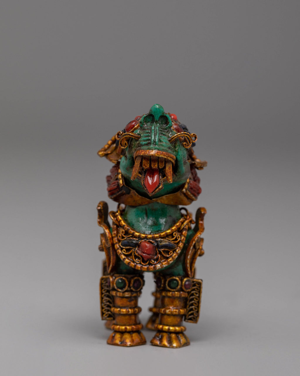 The stupa, traditionally representing the Buddha’s teachings and enlightenment, is elegantly crafted with crystal and gemstone accents, symbolizing purity and divine energy. The intricate details of the copper body and electro gold plating add an aura of timelessness and spiritual depth to the piece. Flanking the stupa are the lion figures, which are fierce protectors of the Buddha's teachings. The lion, a powerful symbol of strength and protection in Tibetan culture, is depicted in vibrant detail, enhanced by the gold plating and gemstones, representing both physical and spiritual guardianship.