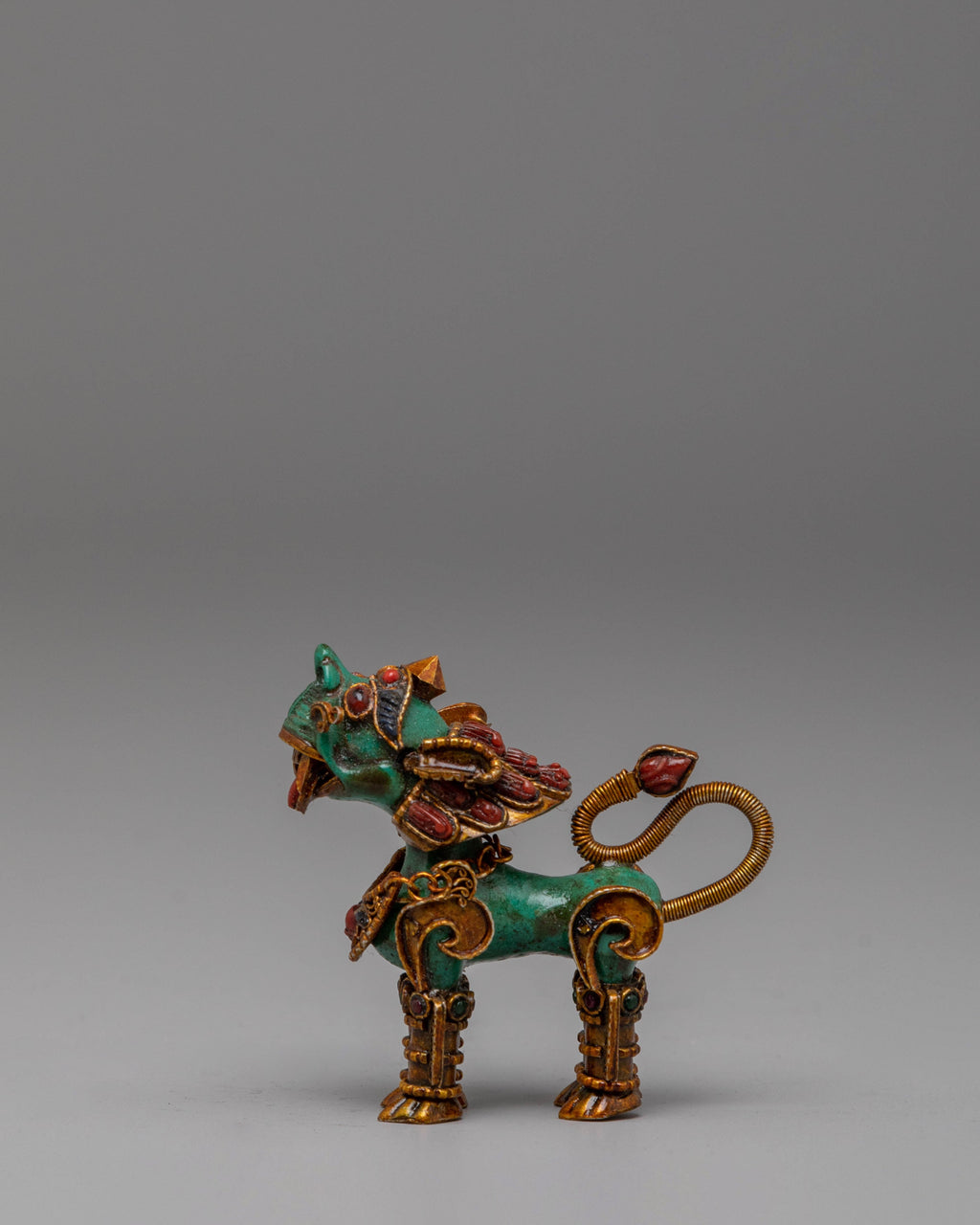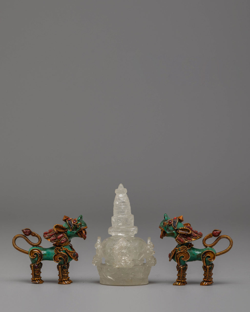 Handcrafted Stupa and Lion Set with Electro Gold Plating and Gemstones