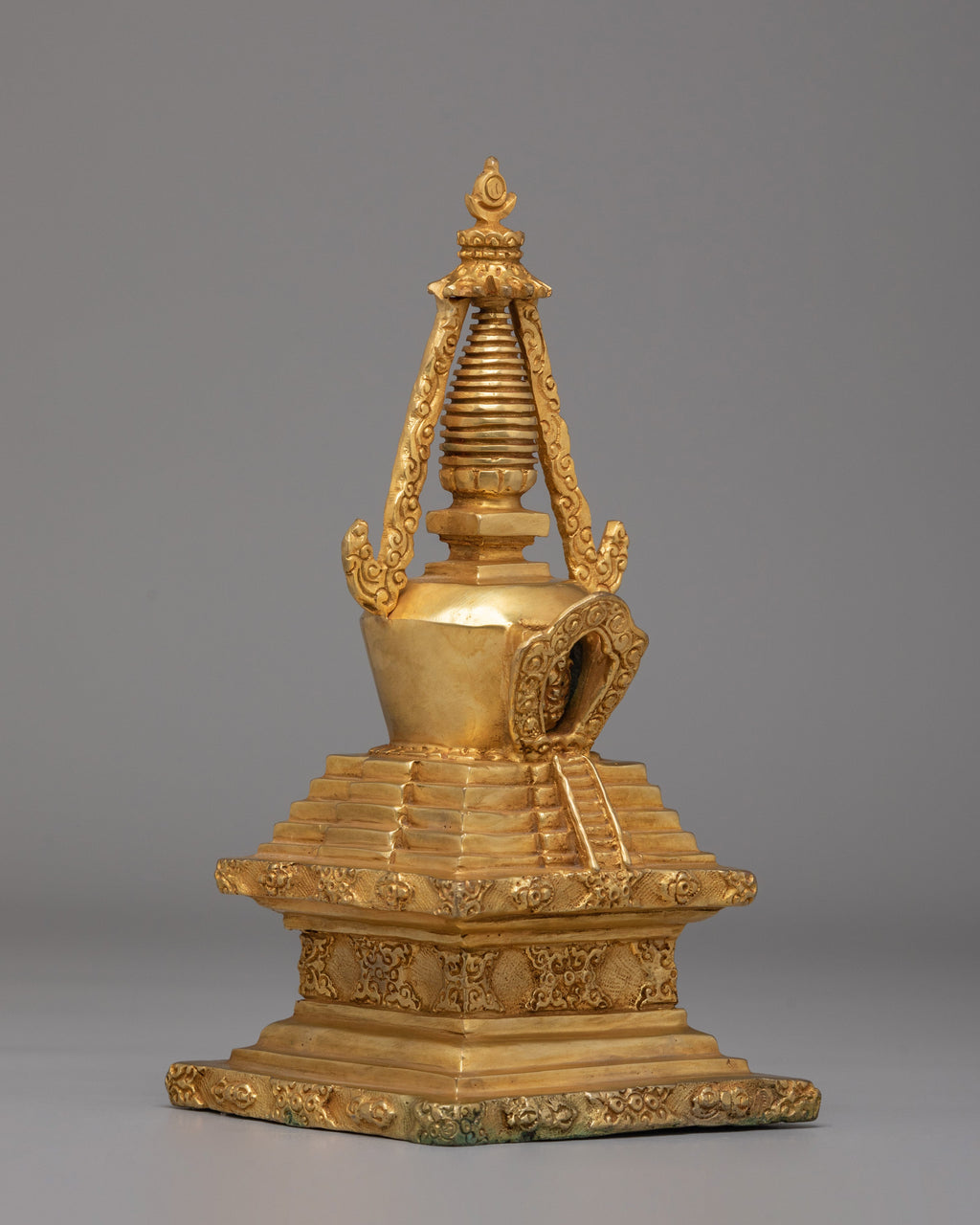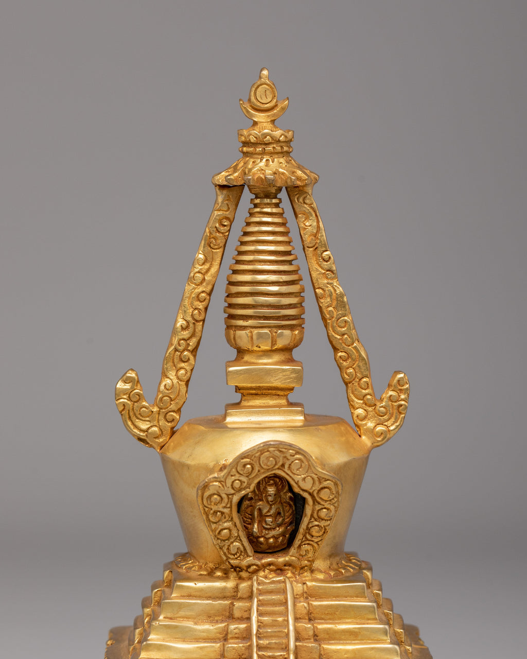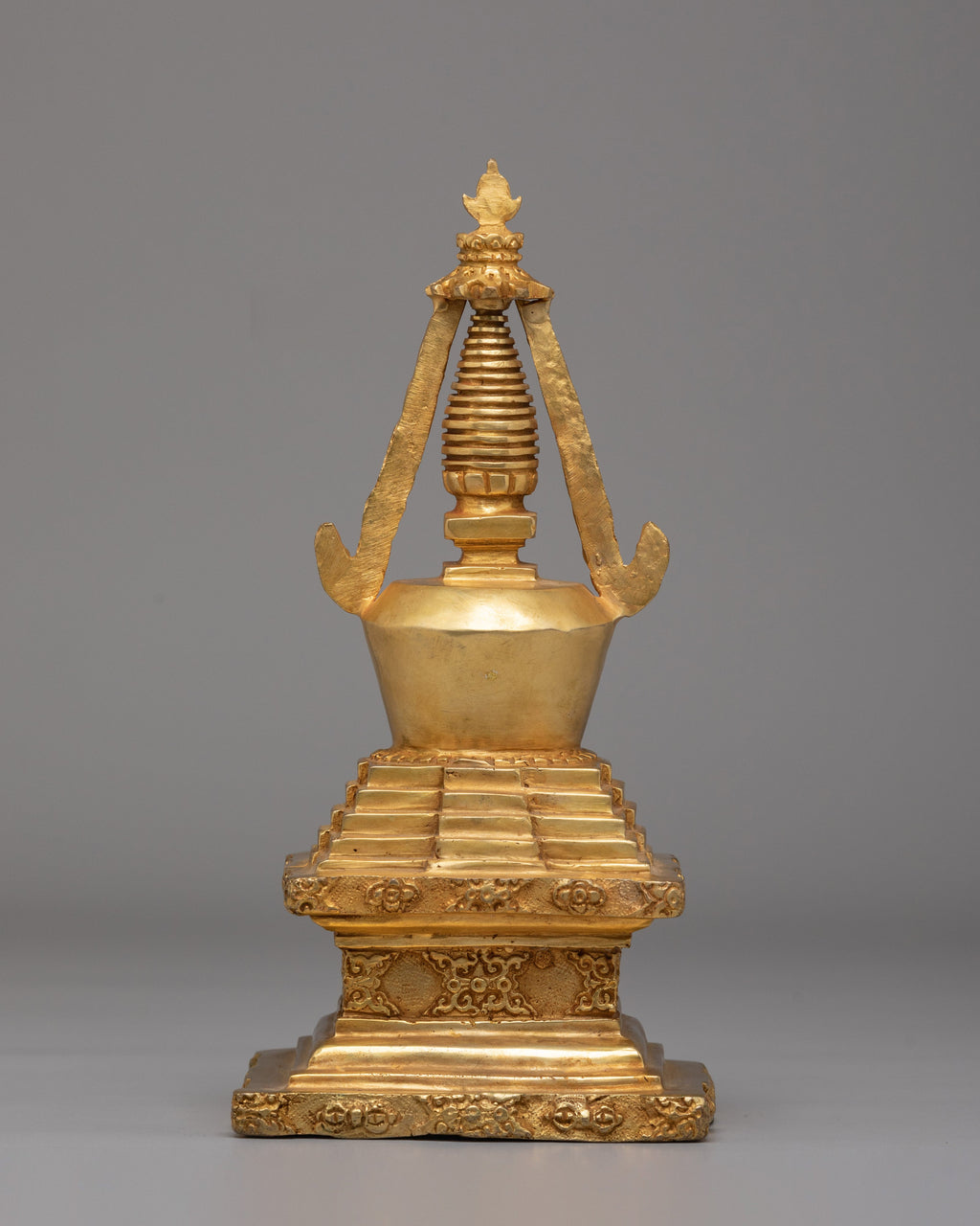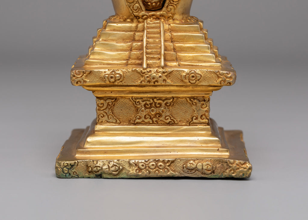 The intricate details on this stupa represent the essential aspects of Buddhist teachings. The design incorporates sacred symbols of protection, purity, and enlightenment, all while embodying the wisdom and compassion that are the foundation of Buddhist practice. The golden finish not only reflects the spiritual richness of Tibetan Buddhism but also adds a luxurious and peaceful aura to your environment, inviting positive energy and peace into your life.