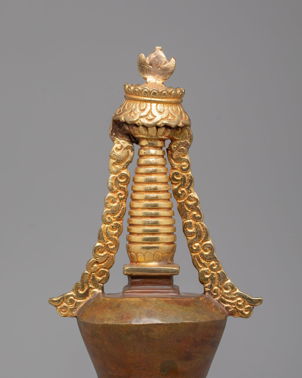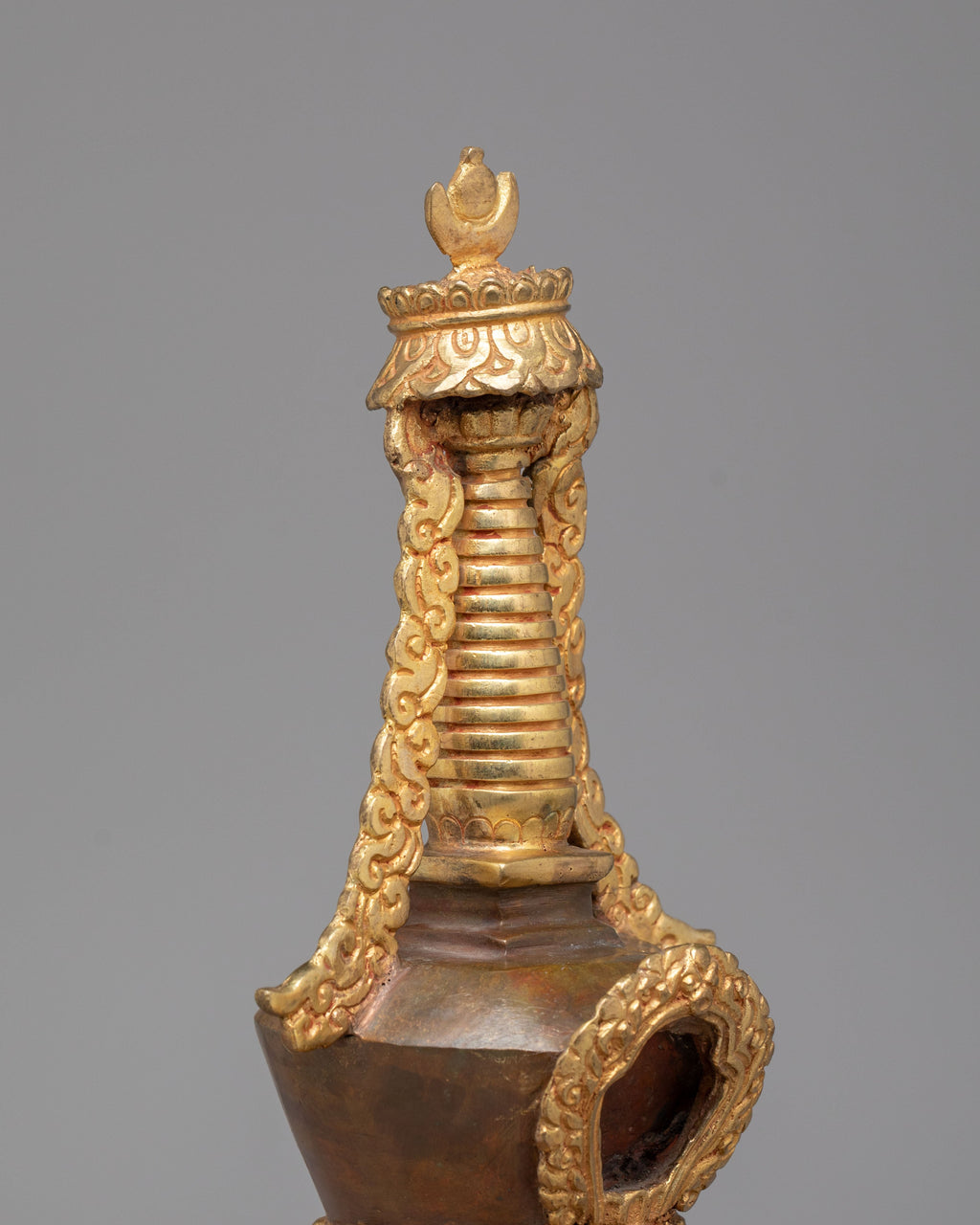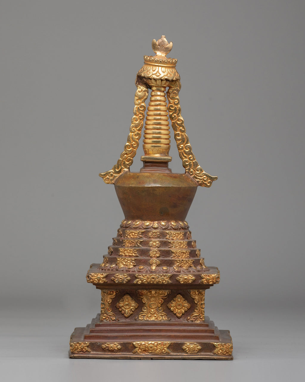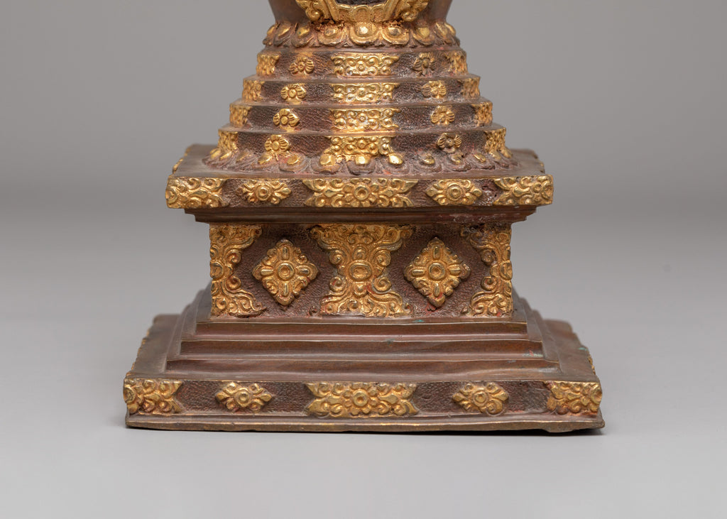 The Stupa Symbol of Peace and Spirituality is a stunning handcrafted piece that embodies the essence of Tibetan Buddhism, combining intricate craftsmanship with deep spiritual meaning. This stupa, crafted from copper and adorned with 24K gold plating, features beautiful acrylic color accents, making it not only a meaningful symbol but also a striking decorative item. The stupa’s elegant design embodies harmony, peace, and enlightenment, making it ideal for both meditative spaces and spiritual collections.