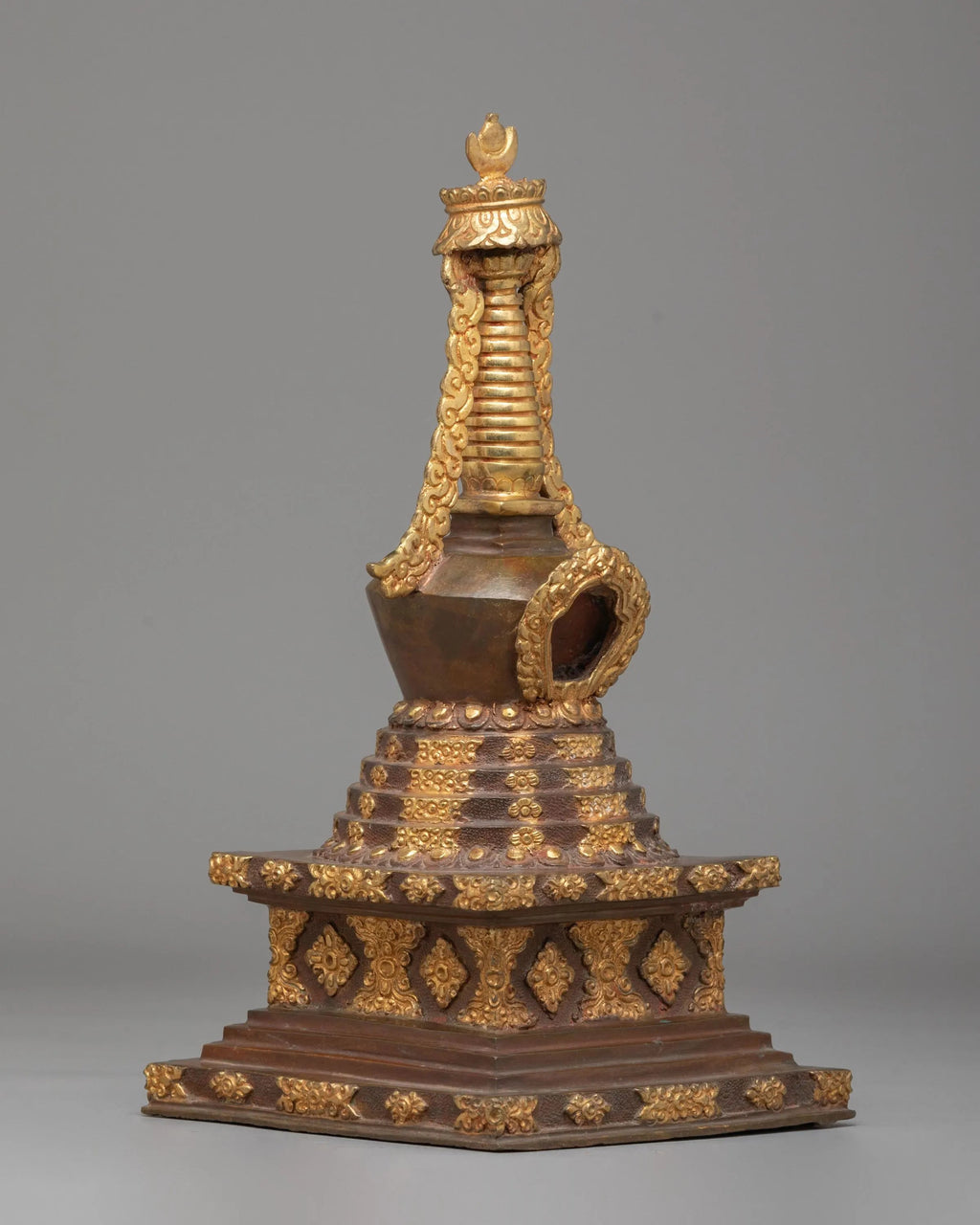The stupa’s design incorporates sacred Buddhist motifs that represent peace, spiritual growth, and protection. It is carefully crafted to reflect the serene energy that a stupa brings to its surroundings, inviting a sense of calm and tranquility. The gold-plated accents highlight the sacred nature of this piece, making it a perfect representation of the Buddhist path to inner peace and enlightenment. This stupa can be placed on altars, meditation spaces, or any environment seeking spiritual balance.