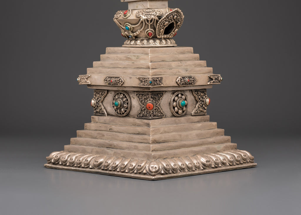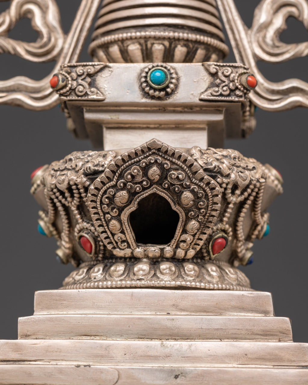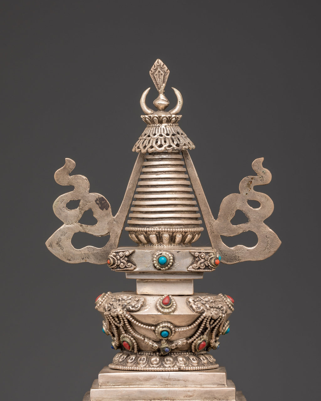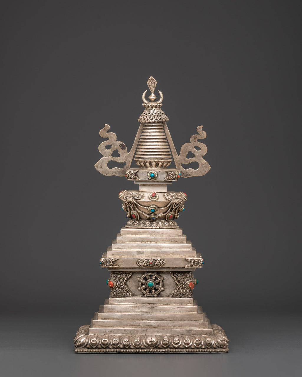 Meticulously crafted, this stupa sculpture offers both aesthetic and spiritual value. The use of copper and silver plating not only gives the sculpture a timeless, elegant finish but also brings a sense of strength and grounding. The artificial stone inlays of Coral and Turquoise are chosen for their symbolic significance—Coral represents vitality and protection, while Turquoise fosters tranquility and positive energy. This stupa sculpture serves as a powerful spiritual reminder, inviting peace, balance, and serenity into your home.