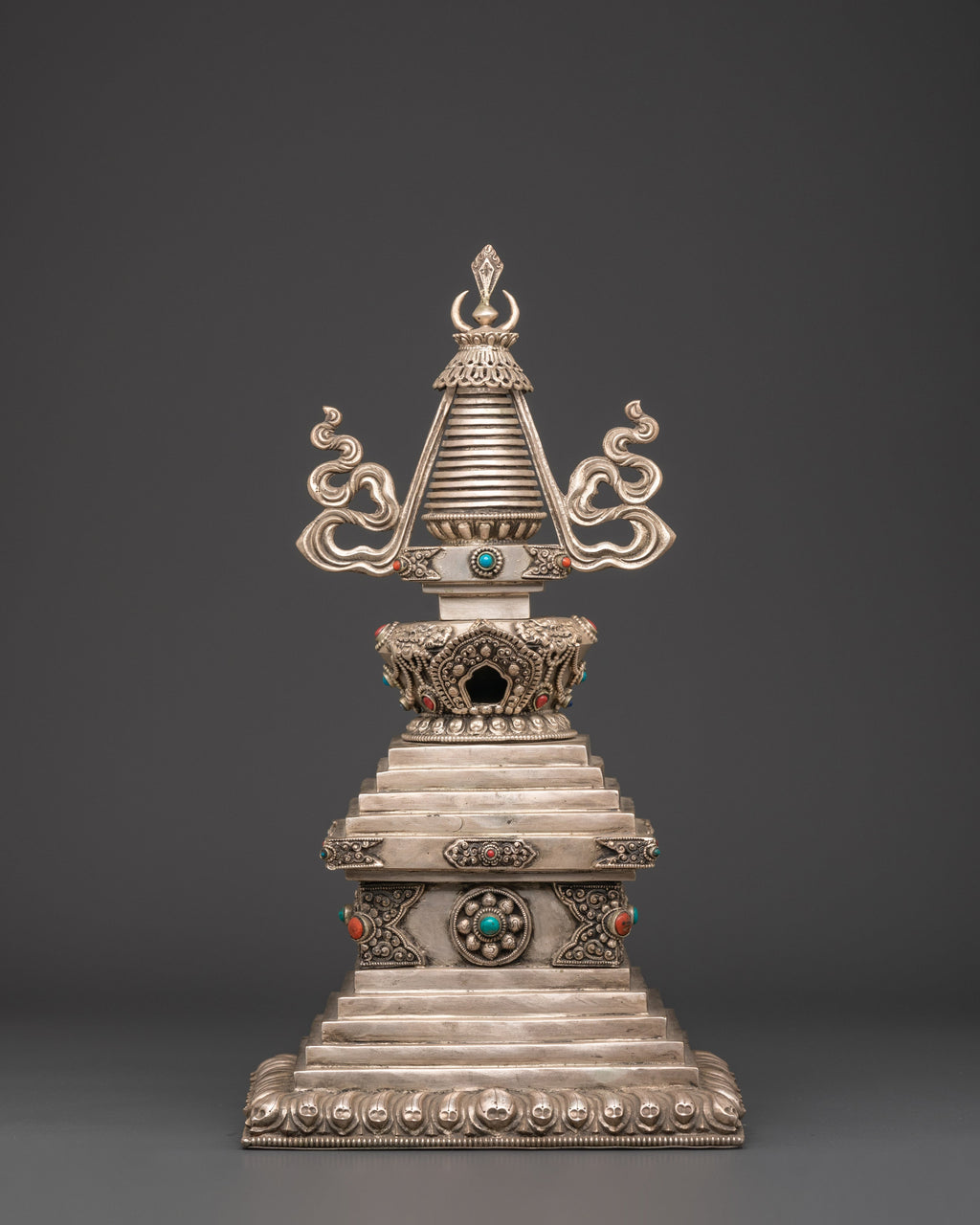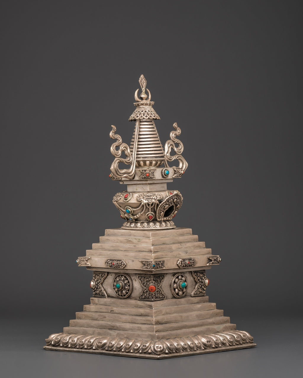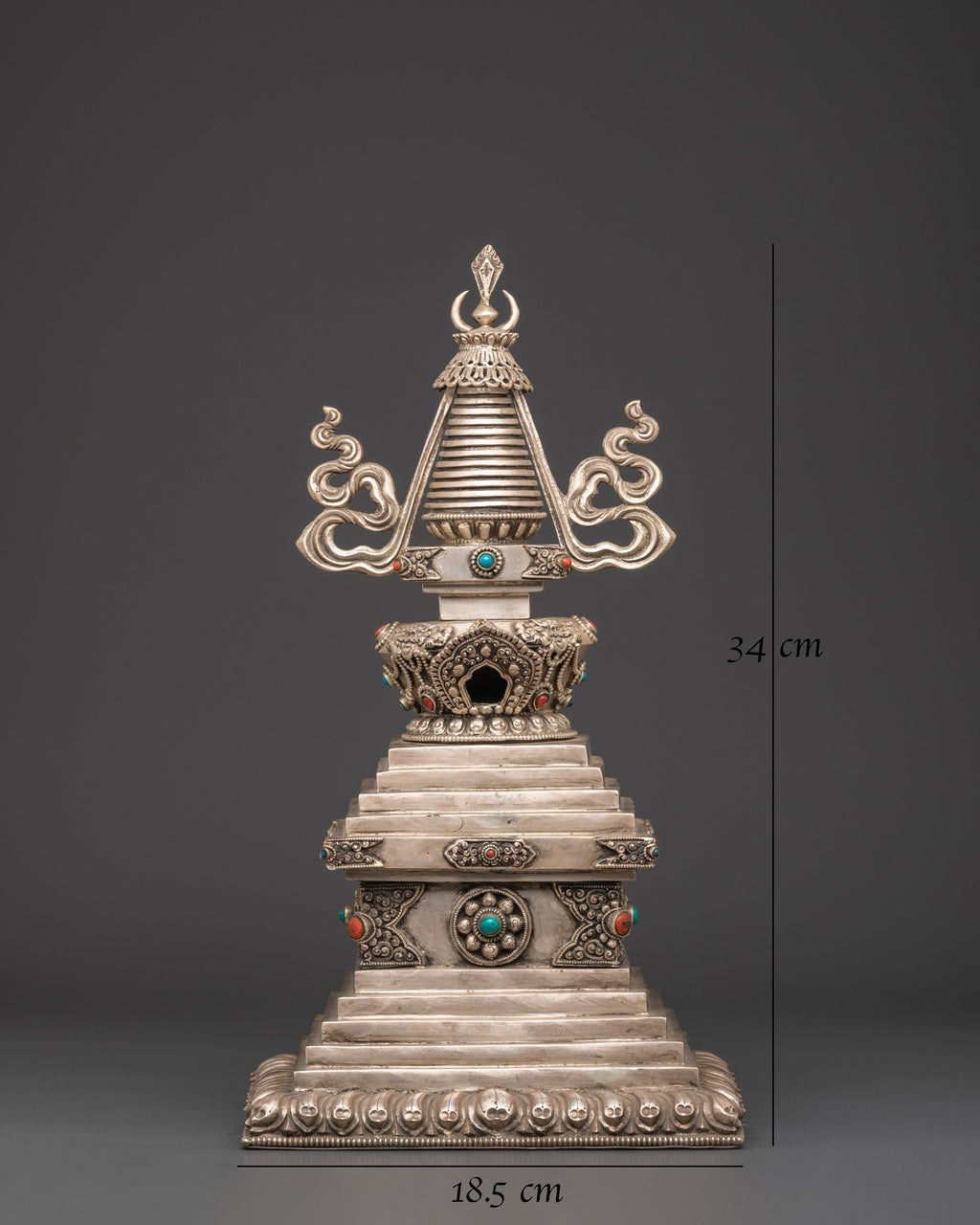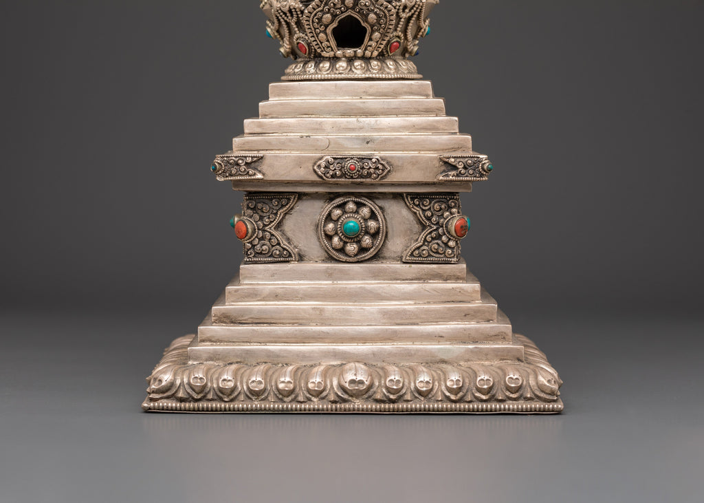 Meticulously crafted, this stupa sculpture offers both aesthetic and spiritual value. The use of copper and silver plating not only gives the sculpture a timeless, elegant finish but also brings a sense of strength and grounding. The artificial stone inlays of Coral and Turquoise are chosen for their symbolic significance—Coral represents vitality and protection, while Turquoise fosters tranquility and positive energy. This stupa sculpture serves as a powerful spiritual reminder, inviting peace, balance, and serenity into your home.