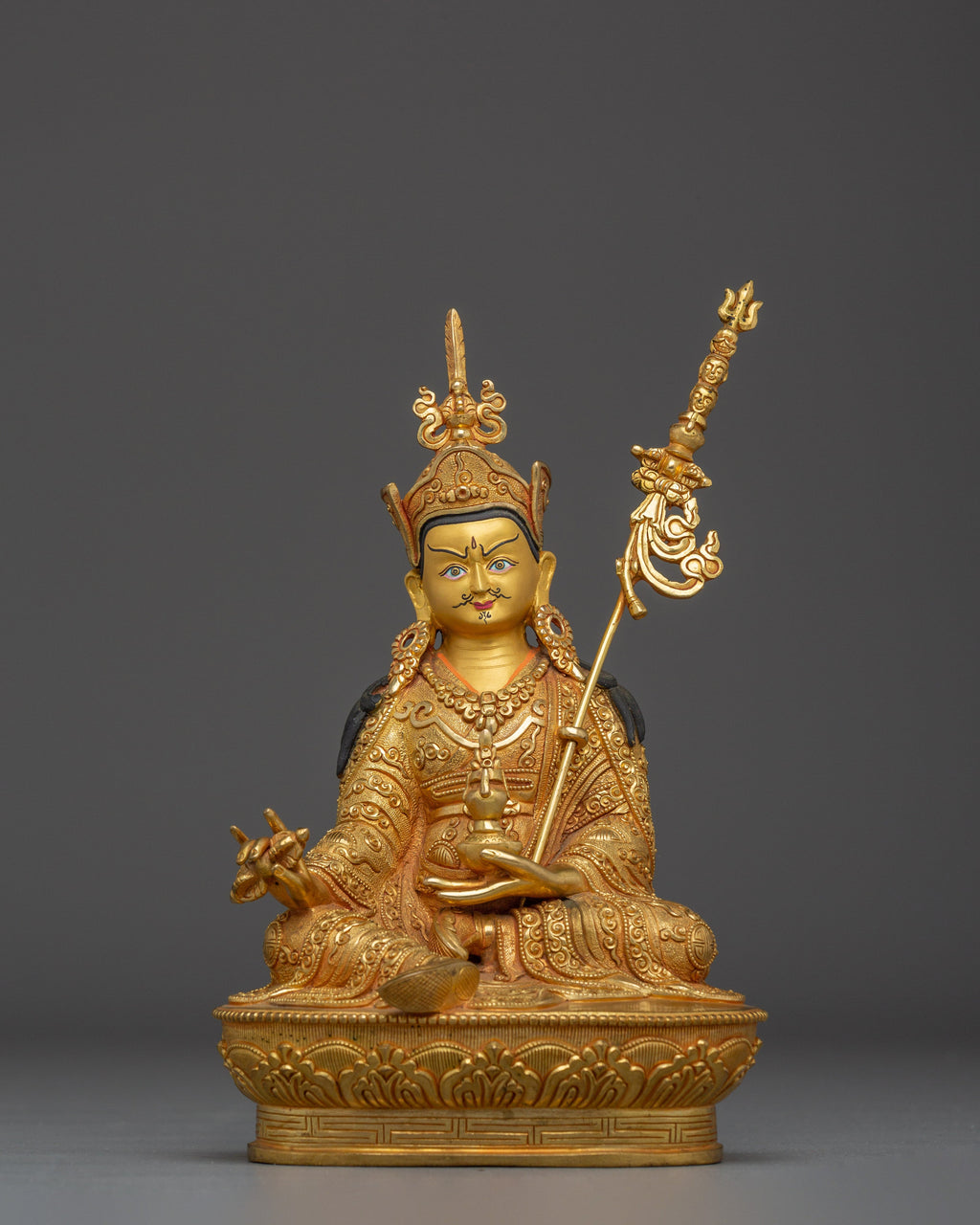Guru Rinpoche is shown seated in a royal posture, one leg folded and the other extended slightly, symbolizing his balance of meditative stillness and readiness to assist sentient beings. He rests on a lotus pedestal, signifying his pure, miraculous birth and freedom from worldly attachment. In his left hand, he holds a kapala (skull cup) containing the vase of immortality, representing spiritual wealth and victory over death. His right hand holds a vajra, symbolizing unshakable clarity and wisdom. Leaning against his shoulder is the khatvanga trident, a tantric symbol of mastery over the three realms and a representation of the Three Kayas—Dharmakaya, Sambhogakaya, and Nirmanakaya. His lotus hat with a feather marks his enlightened status and deep spiritual power.