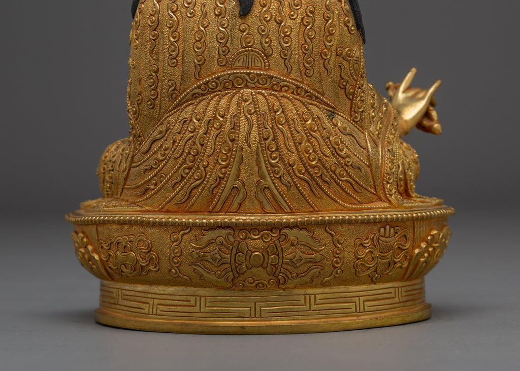 Tantric Buddhism Icon Guru Rinpoche stands 9.3 inches (23.5 cm) tall with a base width of 6.1 inches (15.5 cm) and weighs approximately 1.40 kg. Expertly crafted from a copper body, the figure is adorned with rich 24K gold gilding and enhanced by intricate gold and acrylic paintings. The refined detailing highlights the mastery of traditional Himalayan craftsmanship, making it a spiritually significant and visually captivating piece. Ideal for altars or meditation spaces, it represents Guru Rinpoche’s enlightened presence and his role in spreading Vajrayana Buddhism, offering blessings of protection, wisdom, and transformation.