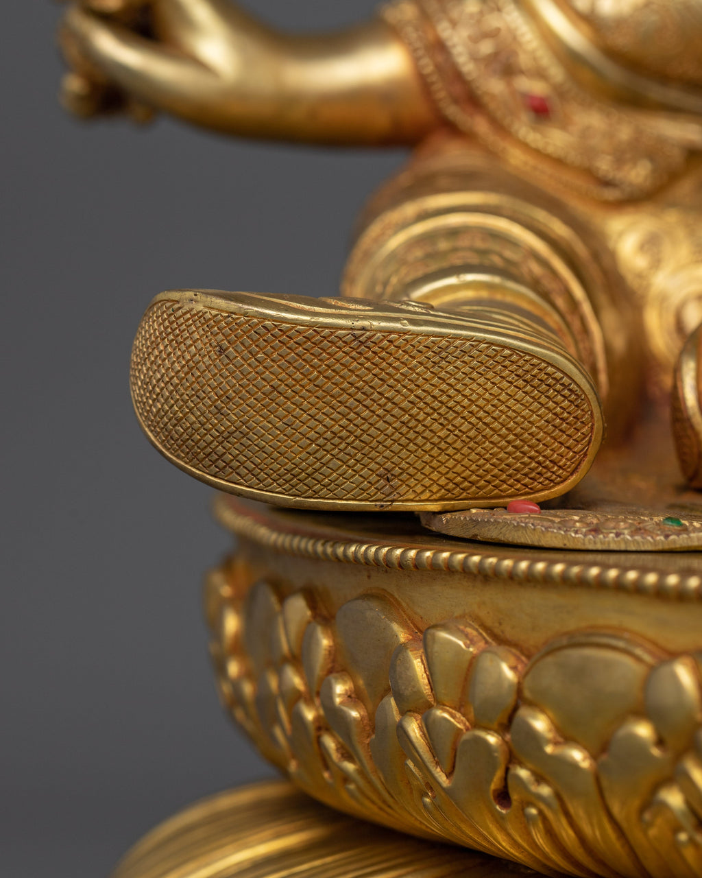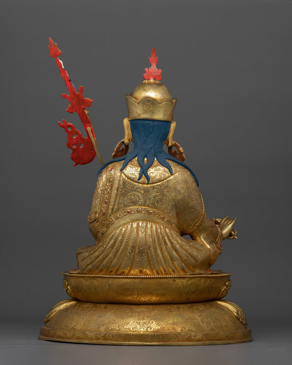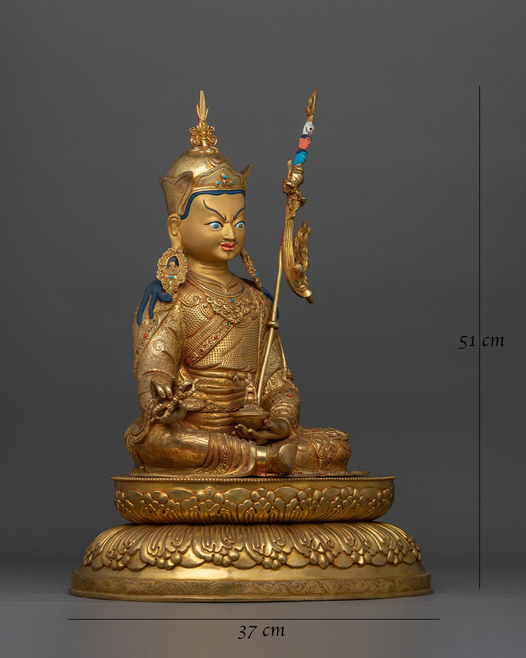 Padmasambhava, also known as Tantric Buddhist Vajra Master Guru Rinpoche, is revered as the founder of Tibetan Buddhism and a master of Vajrayana teachings. With this exquisite 20" handcrafted statue, you can embody the strength and knowledge of Guru Rinpoche. This work of art, which has a copper body and is gilded in triple layer 24K gold, is further enhanced with acrylic and gold paints with deeply engraved 3D-like carvings. Its weight of 10.14 kg and dominating presence make it the focal point of any altar, temple, or spiritual space.