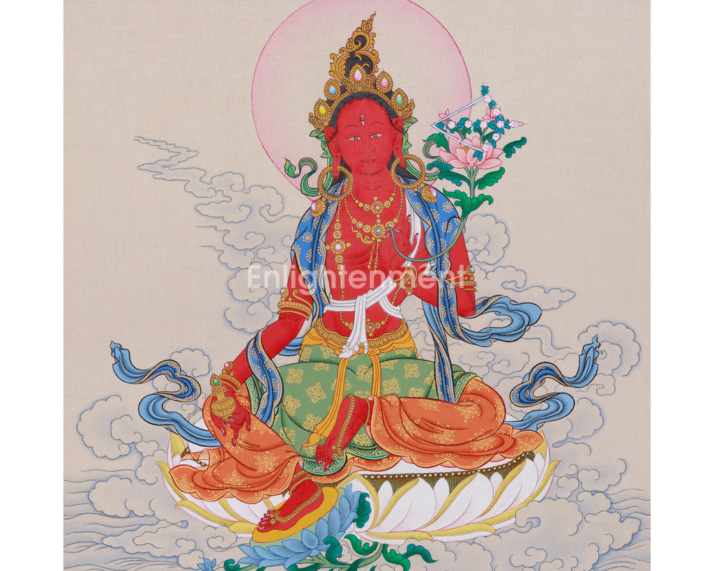 Red Tara is shown in a regal, relaxed stance, signifying her readiness for compassionate action. She wears a five-jeweled crown that symbolizes the five Buddha families and enlightened qualities. In her right hand, she gently holds a vase filled with nectar, representing abundance and purification. Her left hand, softly clutching a bow and arrow resting on a lotus, signifies her strength to overcome obstacles and protect all beings. She sits peacefully on a lotus, embodying purity and spiritual awakening. The detailed, harmonious design highlights her fierce yet benevolent nature as a protector and swift savior in tantric Buddhist practice. This thangka serves as both an inspiring devotional piece and a potent spiritual tool for those seeking courage, protection, and compassion.